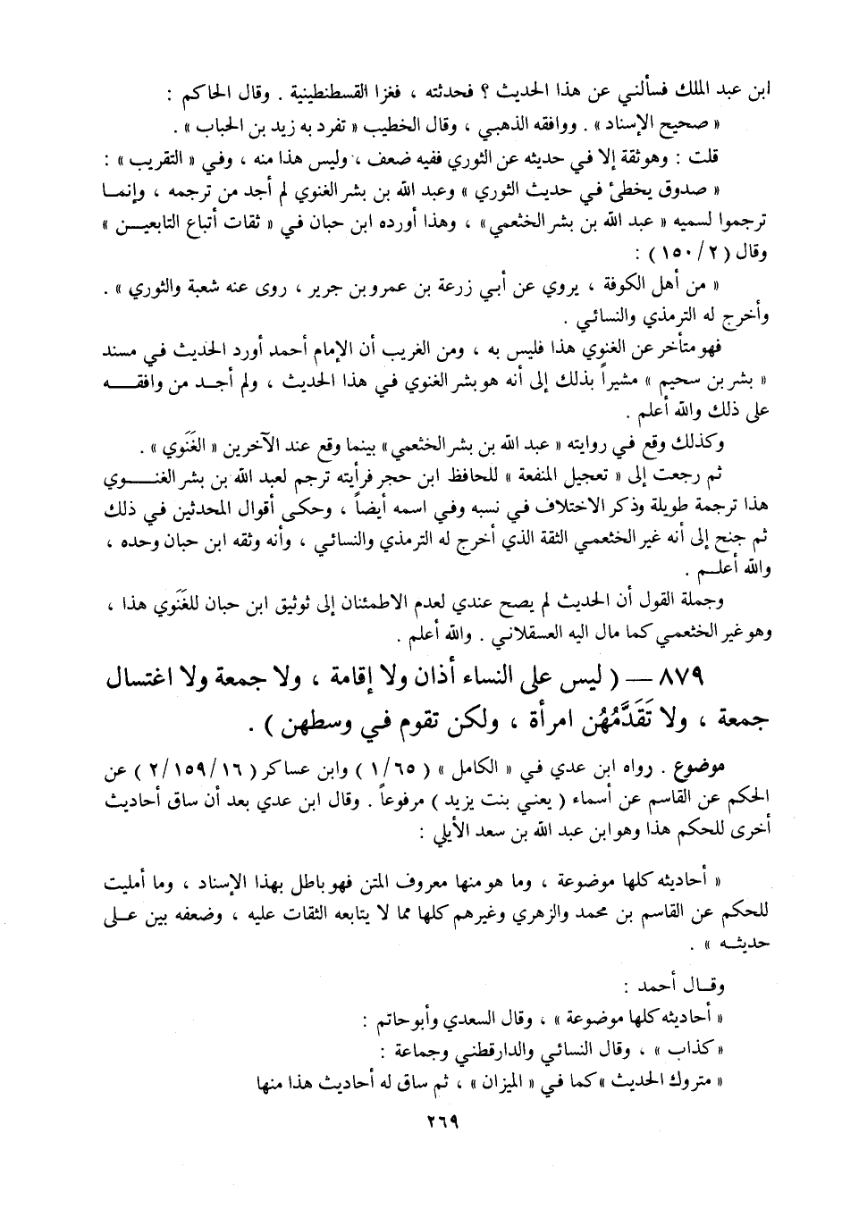 879 - " ليس على النساء أذان ولا إقامة ولا جمعة ولا اغتسال جمعة ولا تقدمهن امرأة ولكن تقوم في وسطهن ".