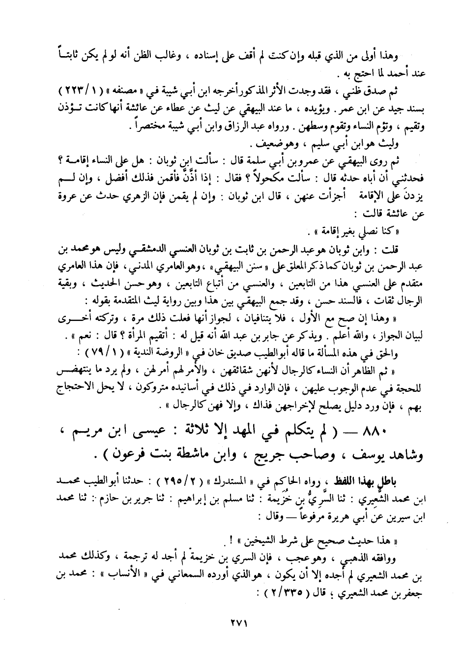 ويذكر عن جابر بن عبد الله أنه قيل له: أتقيم المرأة؟ قال: نعم ". والحق في هذه المسألة ما قاله أبو الطيب صديق خان في " الروضة الندية " (1 / 79) : " ثم الظاهر أن النساء كالرجال لأنهن شقائقهن، والأمر لهم أمر لهن، ولم يرد ما ينتهض للحجة في عدم الوجوب عليهن، فإن الوارد في ذلك في أسانيده متروكون لا يحل الاحتجاج بهم، فإن ورد دليل يصلح لإخراجهن فذاك، وإلا فهن كالرجال ".