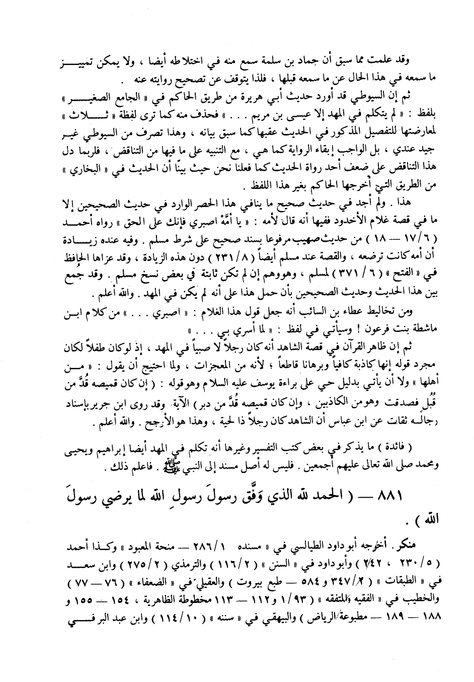 وقد علمت مما سبق أن حماد بن سلمة سمع منه في اختلاطه أيضا، ولا يمكن تمييز ما سمعه في هذا الحال عن ما سمعه قبلها، فلذا يتوقف عن تصحيح روايته عنه. ثم إن السيوطي قد أورد حديث أبي هريرة من طريق الحاكم في " الجامع الصغير " بلفظ: " لم يتكلم في المهد إلا عيسى ابن مريم ... " فحذف منه كما ترى لفظة " ثلاثة " لمعارضتها للتفصيل المذكور في الحديث عقبها كما سبق بيانه، وهذا تصرف من السيوطي غير جيد عندي، بل الواجب إبقاء الرواية كما هي، مع التنبيه على ما فيها من التناقض، فلربما دل هذا التناقض على ضعف أحد رواة الحديث كما فعلنا نحن حيث بينا أن الحديث في " البخاري " من الطريق التي أخرجها الحاكم بغير هذا اللفظ.
