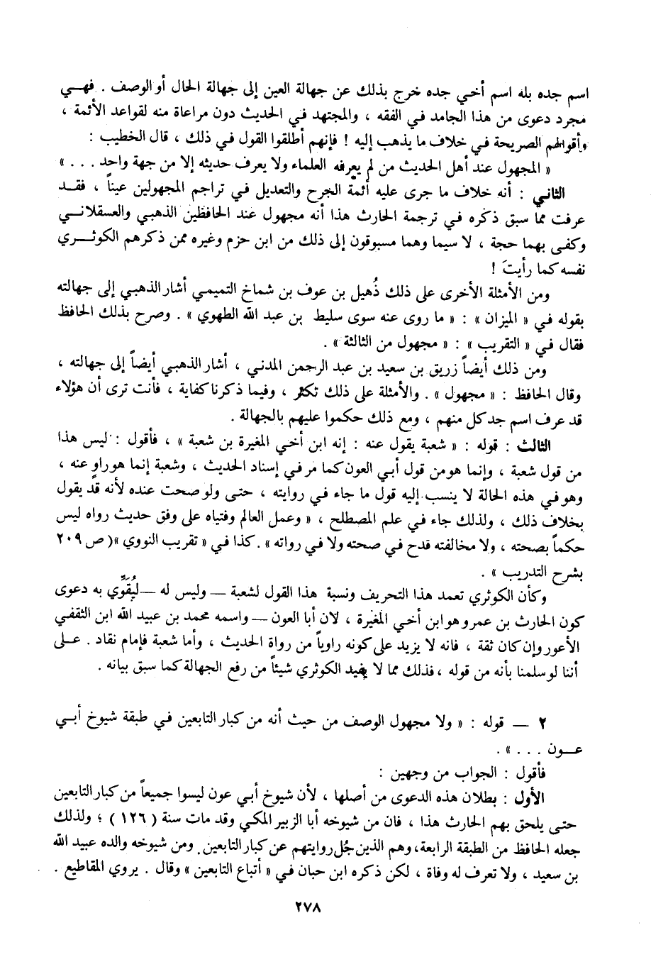 الثالث: قوله: " شعبة يقول عنه: إنه ابن أخي المغيرة بن شعبة ". فأقول: ليس هذا من قول شعبة، وإنما هو من قول أبي العون كما مر في إسناد الحديث، وشعبة إنما هو راوعنه، وهو في هذه الحالة لا ينسب إليه قول ما جاء في روايته، حتى ولوصحت عنده لأنه قد يقول بخلاف ذلك، ولذلك جاء في علم المصطلح، " وعمل العالم وفتياه على وفق حديث رواه ليس حكما بصحته، ولا مخالفته قدح في صحته ولا في رواته ". كذا في " تقريب النووي " (ص 209 بشرح التدريب) . وكأن الكوثري تعمد هذا التحريف ونسبة هذا القول لشعبة - وليس له - ليقوي به دعوى كون الحارث بن عمرو هذا ابن أخي المغيرة، لأن أبا العون - واسمه محمد بن عبيد الله ابن الثقفي الأعور وإن كان ثقة، فإنه لا يزيد على كونه راويا من رواة الحديث، وأما شعبة فإمام نقاد. على أننا لوسلمنا بأنه من قوله، فذلك مما لا يفيد الكوثري شيئا من رفع الجهالة كما سبق بيانه.