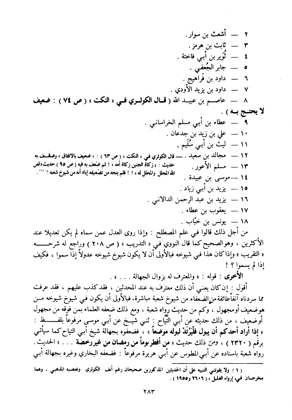 الأخرى: قوله: " والمعترف له بزوال الجهالة.... ". أقول: إن كان يعني أن ذلك معترف به عند المحدثين، فقد كذب عليهم، فقد عرفت مما سردناه آنفا طائفة من الضعفاء من شيوخ شعبة مباشرة، فبالأولى أن يكون في شيوخ شيوخه من هو ضعيف أو مجهول، وكم من حديث رواه شعبة، ومع ذلك ضعفه العلماء بمن فوقه من مجهول أو ضعيف، من ذلك حديثه عن أبي التياح: حدثني شيخ عن أبي موسى مرفوعا بلفظ: " إذا أراد أحدكم أن يبول فليرتد لبوله موضعا ".