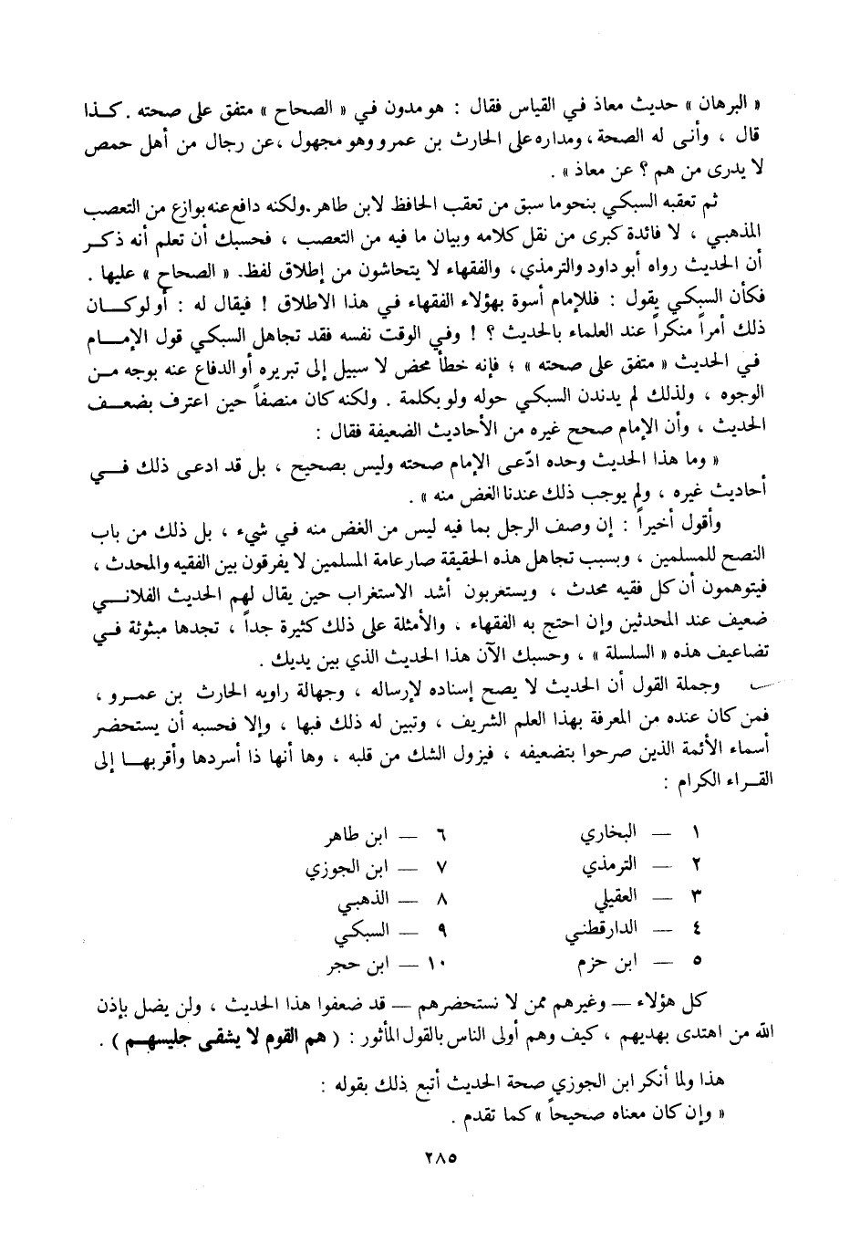 " البرهان " حديث معاذ في القياس فقال: هو مدون في " الصحاح " متفق على صحته. كذا قال، وأنى له الصحة، ومداره على الحارث بن عمرو وهو مجهول، عن رجال من أهل حمص لا يدري من هم؟ عن معاذ ".
