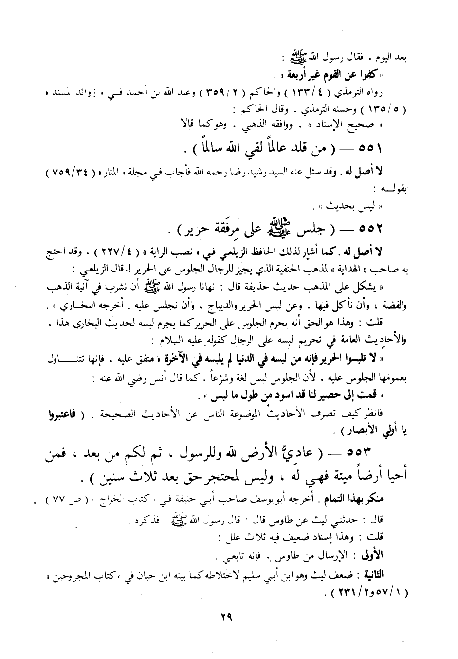 من لبسه في الدنيا لم يلبسه في الآخرة " متفق عليه، فإنها تتناول بعمومها الجلوس عليه، لأن الجلوس لبس لغة وشرعا، كما قال أنس رضي الله عنه: " قمت إلى حصير لنا قد اسود من طول ما لبس ". فانظر كيف تصرف الأحاديث الموضوعة الناس عن الأحاديث الصحيحة. (فاعتبروا يا أولي الأبصار) .
