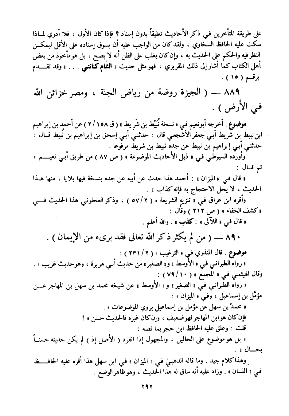 فإن كان هو ابن المهاجر فهو ضعيف، وإن كان غيره فالحديث حسن "! قلت: وعلق عليه الحافظ ابن حجر بما نصه: " بل هو موضوع على الحالين، والمجهول إذا انفرد (الأصل إذ) لم يكن حديثه حسنا بحال ". وهذا كلام جيد. وما قاله الذهبي في " الميزان " في ابن سهل هذا أقره عليه الحافظ في " اللسان ". وزاد عليه أنه ساق له هذا الحديث، وهو ظاهر الوضع.