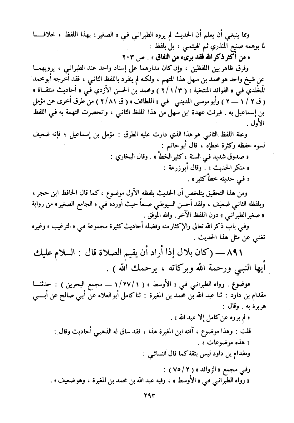 مما ينبغي أن يعلم أن الحديث لم يرو هـ الطبراني في " الصغير " بهذا اللفظ، خلافا لما يوهمه صنيع المنذري ثم الهيثمي، بل بلفظ: " من أكثر ذكر الله فقد بريء من النفاق ". ص (203) وفرق ظاهر بين اللفظين، وإن كان مدارهما على إسناد واحد عند الطبراني، يرويهما عن شيخ واحد هو محمد بن سهل هذا المتهم، ولكنه لم ينفرد باللفظ الثاني، فقد أخرجه أبو محمد المخلدي في " الفوائد المنتخبة " (3 / 1 / 2) ومحمد بن الحسن الأزدي في " أحاديث منتقاة " (ق 2 / 1 - 2) وأبو موسى المديني في " اللطائف " (ق 81 / 2) من طرق أخرى عن مؤمل بن إسماعيل به، فبرئت عهدة ابن سهل من هذا اللفظ الثاني، وانحصرت التهمة به في اللفظ الأول. وعلة اللفظ الثاني هو هذا الذي دارت عليه الطرق: