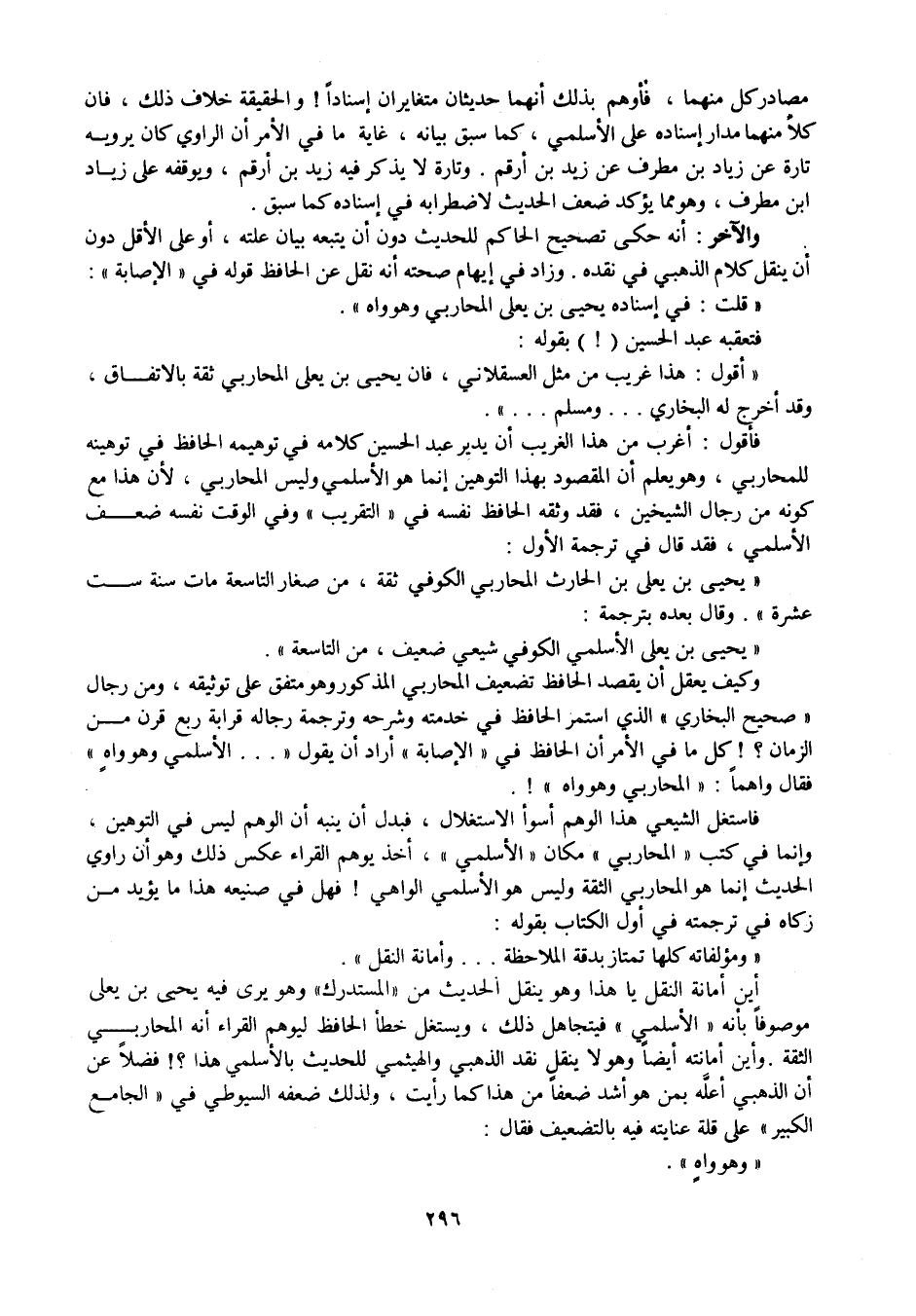فأقول: أغرب من هذا الغريب أن يدير عبد الحسين كلامه في توهيمه الحافظ في توهينه للمحاربي، وهو يعلم أن المقصود بهذا التوهين إنما هو الأسلمي وليس المحاربي، لأن هذا مع كونه من رجال الشيخين، فقد وثقه الحافظ نفسه في " التقريب " وفي الوقت نفسه ضعف الأسلمي، فقد قال في ترجمة الأول: " يحيى بن يعلى بن الحارث المحاربي الكوفي ثقة، من صغار التاسعة مات سنة ست عشرة ". وقال بعده بترجمة: " يحيى بن يعلى الأسلمي الكوفي شيعي ضعيف، من التاسعة ". وكيف يعقل أن يقصد الحافظ تضعيف المحاربي المذكور وهو متفق على توثيقه، ومن رجال " صحيح البخاري " الذي استمر الحافظ في خدمته وشرحه وترجمة رجاله قرابة ربع قرن من الزمان؟! كل ما في الأمر أن الحافظ في " الإصابة " أراد أن يقول " ... الأسلمي وهو واه "، فقال واهما: " المحاربي وهو واه "! . فاستغل الشيعي هذا الوهم أسوأ الاستغلال، فبدل أن ينبه أن الوهم ليس في التوهين، وإنما في كتب " المحاربي مكان الأسلمي "، أخذ يوهم القراء عكس ذلك وهو أن راوي الحديث إنما هو المحاربي الثقة وليس هو الأسلمي الواهي!