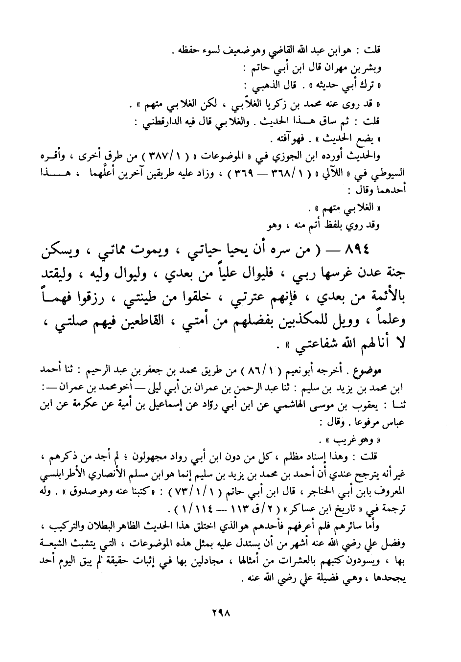 894 - " من سره أن يحيا حياتي، ويموت مماتي، ويسكن جنة عدن غرسها ربي، فليوال عليا من بعدي، وليوال وليه، وليقتد بالأئمة من بعدي، فإنهم عترتي، خلقوا من طينتي، رزقوا فهما وعلما، وويل للمكذبين بفضلهم من أمتي، القاطعين فيهم صلتي، لا أنالهم الله شفاعتي ".