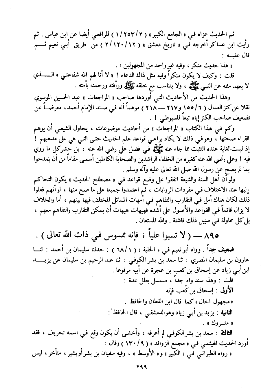 قلت: وكيف لا يكون منكرا وفيه مثل ذاك الدعاء! " لا أنالهم الله شفاعتي " الذي لا يعهد مثله عن النبي صلى الله عليه وسلم، ولا يتناسب مع خلقه صلى الله عليه وسلم ورأفته ورحمته بأمته. وهذا الحديث من الأحاديث التي أوردها صاحب " المرجعات " عبد الحسين الموسوي نقلا عن كنز العمال (6 / 155 و217 - 218) موهما أنه في مسند الإمام أحمد، معرضا عن تضعيف صاحب الكنز إياه تبعا للسيوطي! .