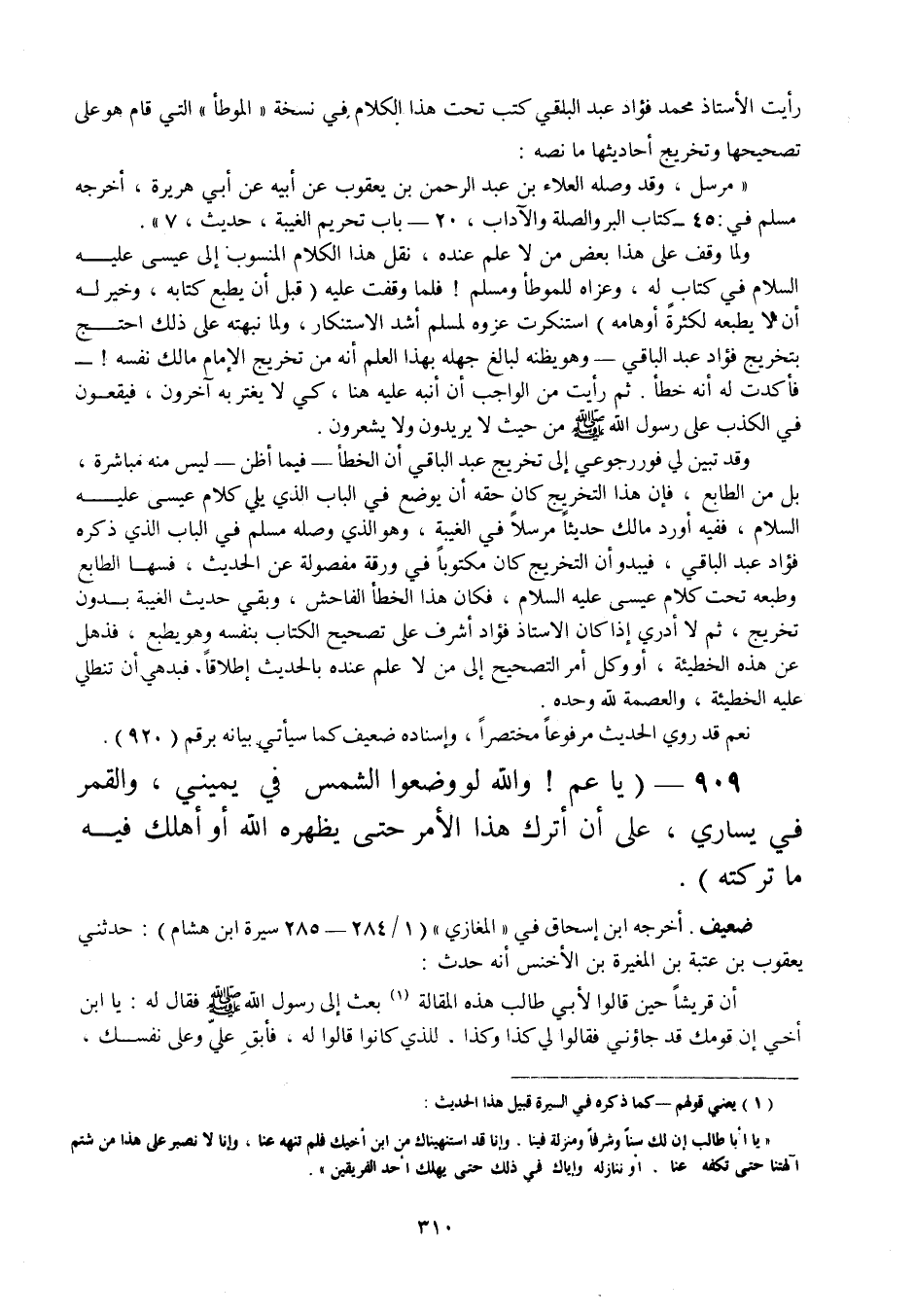 وقد تبين لي فور رجوعي إلى تخريج عبد الباقي أن الخطأ - فيما أظن - ليس منه مباشرة، بل من الطابع، فإن هذا التخريج كان حقه أن يوضع في الباب الذي يلي كلام عيسى عليه السلام، ففيه أورد مالك حديثا مرسلا في الغيبة، وهو الذي وصله مسلم في الباب الذي ذكره فؤاد عبد الباقي، فيبدو أن التخريج كان مكتوبا في ورقة مفصولة عن الحديث، فسها الطابع وطبعه تحت كلام عيسى عليه السلام، فكان هذا الخطأ الفاحش، وبقي حديث الغيبة بدون تخريج، ثم لا أدري إذا كان الأستاذ فؤاد أشرف على تصحيح الكتاب بنفسه وهو يطبع، فذهل عن هذه الخطيئة، أو وكل أمر التصحيح إلى من لا علم عنده بالحديث إطلاقا، فبدهي أن تنطلي عليه الخطيئة، والعصمة لله وحده. نعم قد روي الحديث مرفوعا مختصرا، وإسناده ضعيف كما سيأتي بيانه برقم (920) .