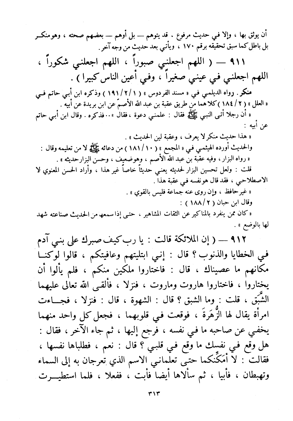 912 - " إن الملائكة قالت: يا رب كيف صبرك على بني آدم في الخطايا والذنوب؟ قال: إني ابتليتهم وعافيتكم، قالوا لوكنا مكانهم ما عصيناك، قال فاختاروا ملكين منكم، فلم يألوا أن يختاروا، فاختاروا هاروت وماروت، فنزلا، فألقى الله تعالى عليهما الشبق، قلت: وما الشبق؟ قال: الشهو ة، قال: فنزلا، فجاءت امرأة يقال لها الزهرة، فوقعت في قلوبهما، فجعل كل واحد منهما يخفي عن صاحبه ما في نفسه، فرجع إليها، ثم جاء الآخر، فقال: هل وقع في نفسك ما وقع في قلبي؟ قال: نعم، فطلباها نفسها، فقالت: لا أمكنكما حتى تعلماني الاسم الذي تعرجان به إلى السماء وتهبطان، فأبيا، ثم سألاها أيضا فأبت، ففعلا فلما استطيرت