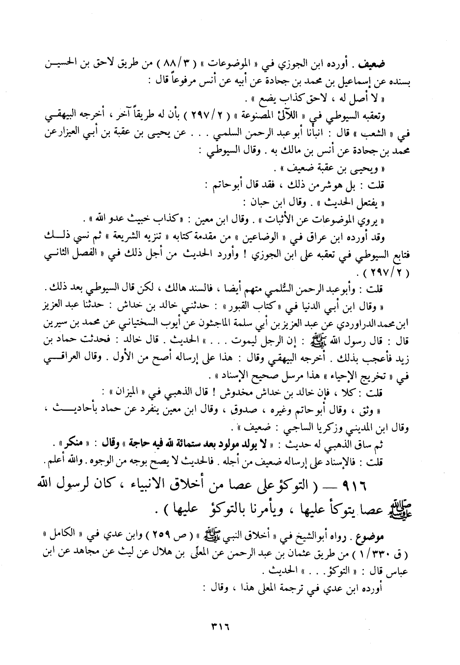 وتعقبه السيوطي في " اللآلىء المصنوعة " (2 / 297) بأن له طريق آخر، أخرجه البيهقي في " الشعب " قال: أنبأنا أبو عبد الرحمن السلمي ... عن يحيى بن عقبة بن أبي العيزار عن محمد بن جحادة عن أنس بن مالك به وقال السيوطي: " ويحيى بن عقبة ضعيف ".