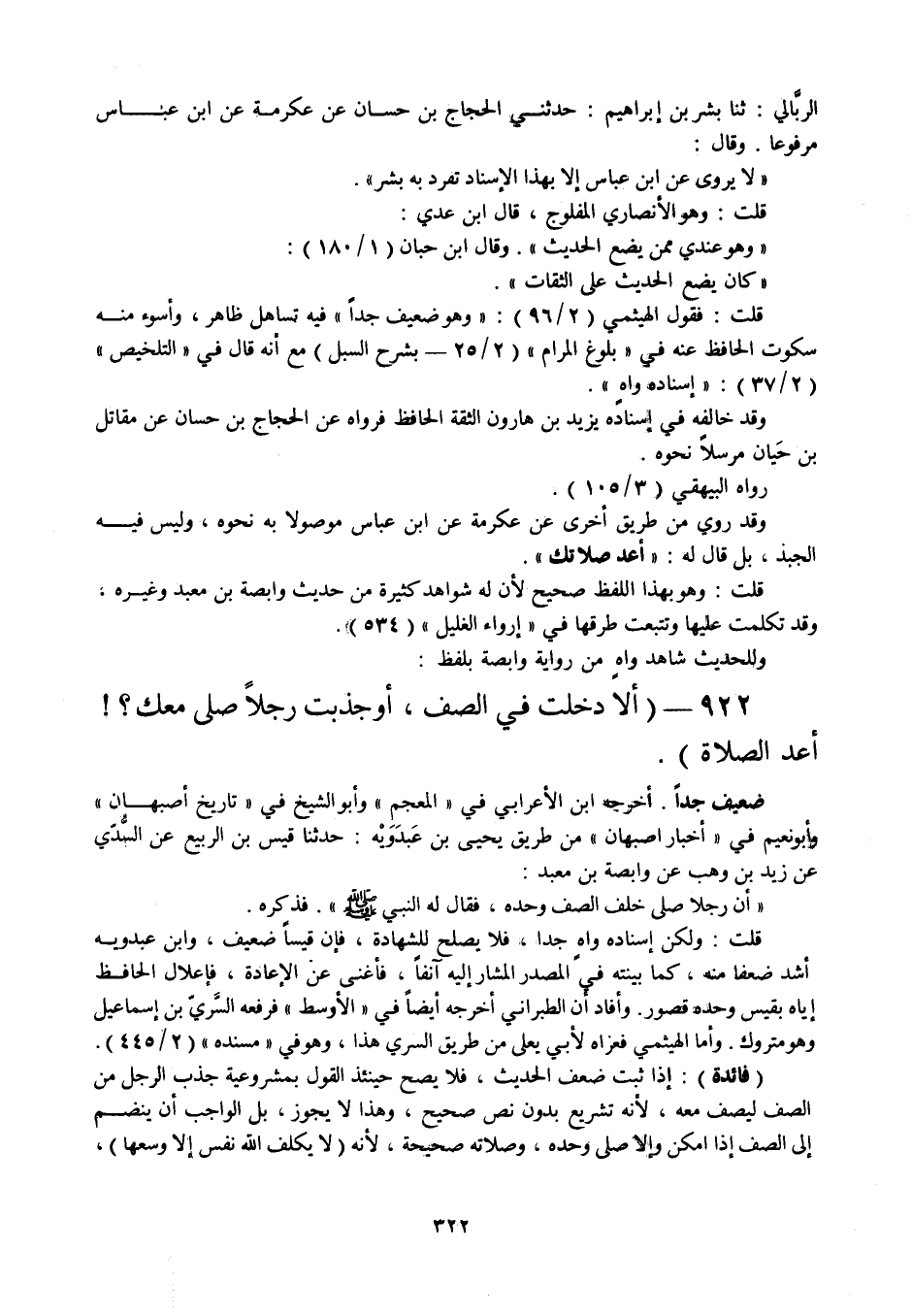 رواه البيهقي (3 / 105) . وقد روي من طريق أخرى عن عكرمة عن ابن عباس موصولا به نحوه، وليس فيه الجبذ، بل قال له: " أعد صلاتك ". قلت: وهو بهذا اللفظ صحيح لأن له شواهد كثيرة من حديث وابصة بن معبد وغيره وقد تكلمت عليها وتتبعت طرقها في " إرواء الغليل " (534) وللحديث شاهد واه من رواية وابصة بلفظ: " ألا دخلت في الصف، أو جذبت رجلا صلى معك؟! أعد صلاتك ".