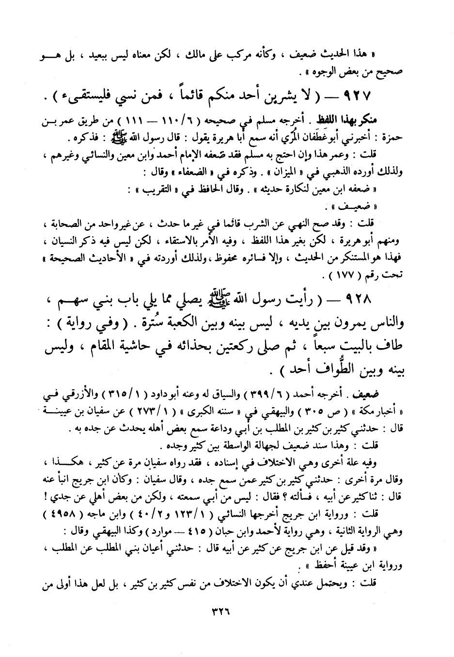 928 - " رأيت رسول الله صلى الله عليه وسلم يصلي مما يلي باب بني سهم، والناس يمرون بين يديه، ليس بينه وبين الكعبة سترة. (وفي رواية) : طاف بالبيت سبعا، ثم صلى ركعتين بحذائه في حاشية المقام، وليس بينه وبين الطواف أحد ".