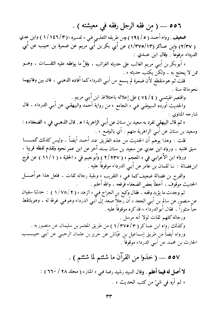 لا يحتج به، ولكن يكتب حديثه ". قلت: ثم هو منقطع لأن ضمرة لم يسمع من أبي الدرداء كما أفاده الذهبي، فإن بين وفاتيهما نحومائة سنة. واقتصر الهيثمي (4 / 74) على إعلاله باختلاط ابن أبي مريم. والحديث أورده السيوطي في " الجامع " من رواية أحمد والبيهقي عن أبي الدرداء قال شارحه المناوي: " ثم قال البيهقي تفرد به سعيد بن سنان عن أبي الزاهرية اهـ. قال الذهبي في " الضعفاء ": وسعيد بن سنان عن أبي الزاهرية متهم، أي بالوضع ".