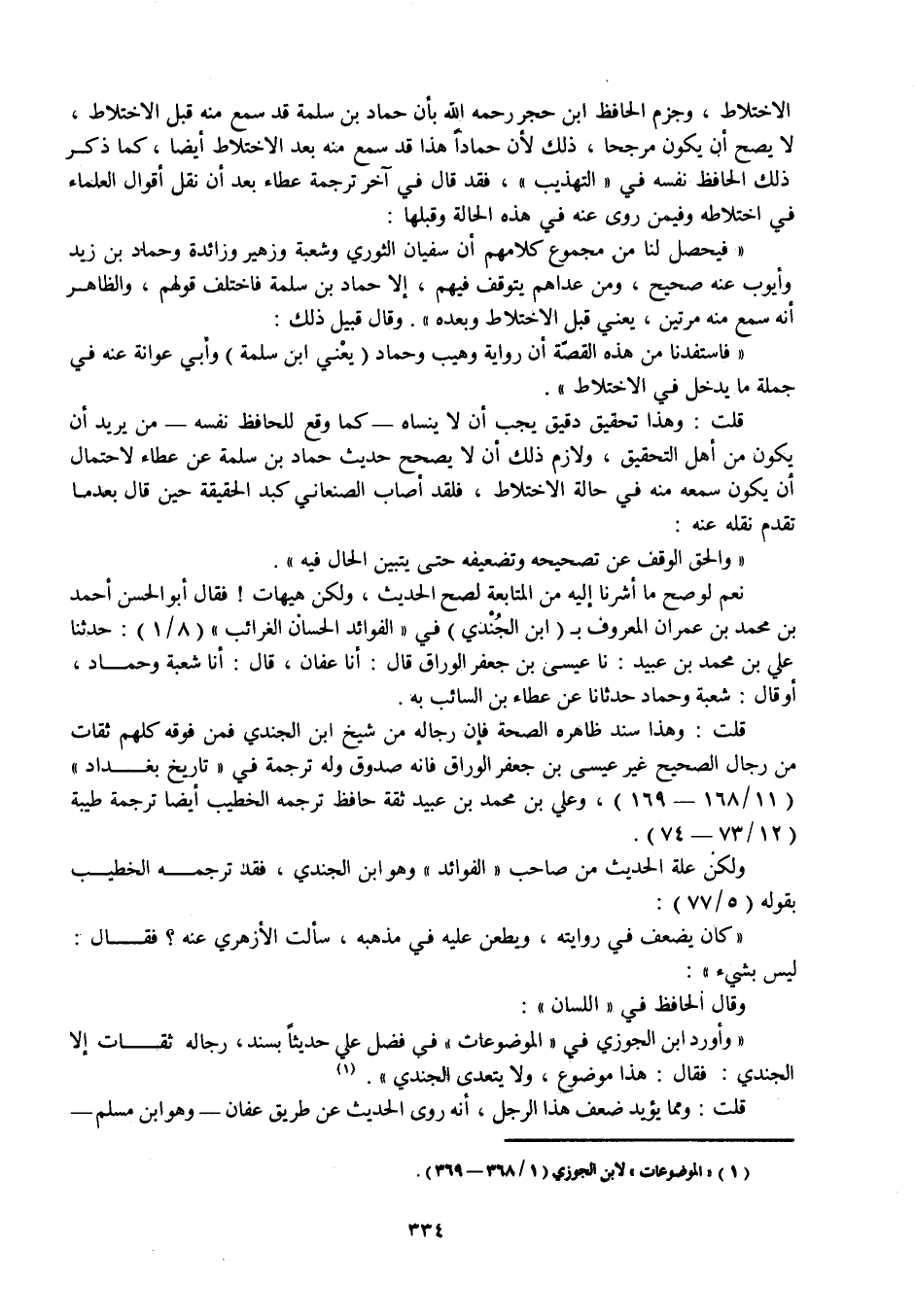 قلت: وهذا تحقيق دقيق يجب أن لا ينساه - كما وقع للحافظ نفسه - من يريد أن يكون من أهل التحقيق، ولازم ذلك أن لا يصحح حديث حماد بن سلمة عن عطاء لاحتمال أن يكون سمعه منه في حالة الاختلاط، فلقد أصاب الصنعاني كبد الحقيقة حين قال بعدما تقدم نقله عنه: " والحق الوقف عن تصحيحه وتضعيفه حتى يتبين الحال فيه ".