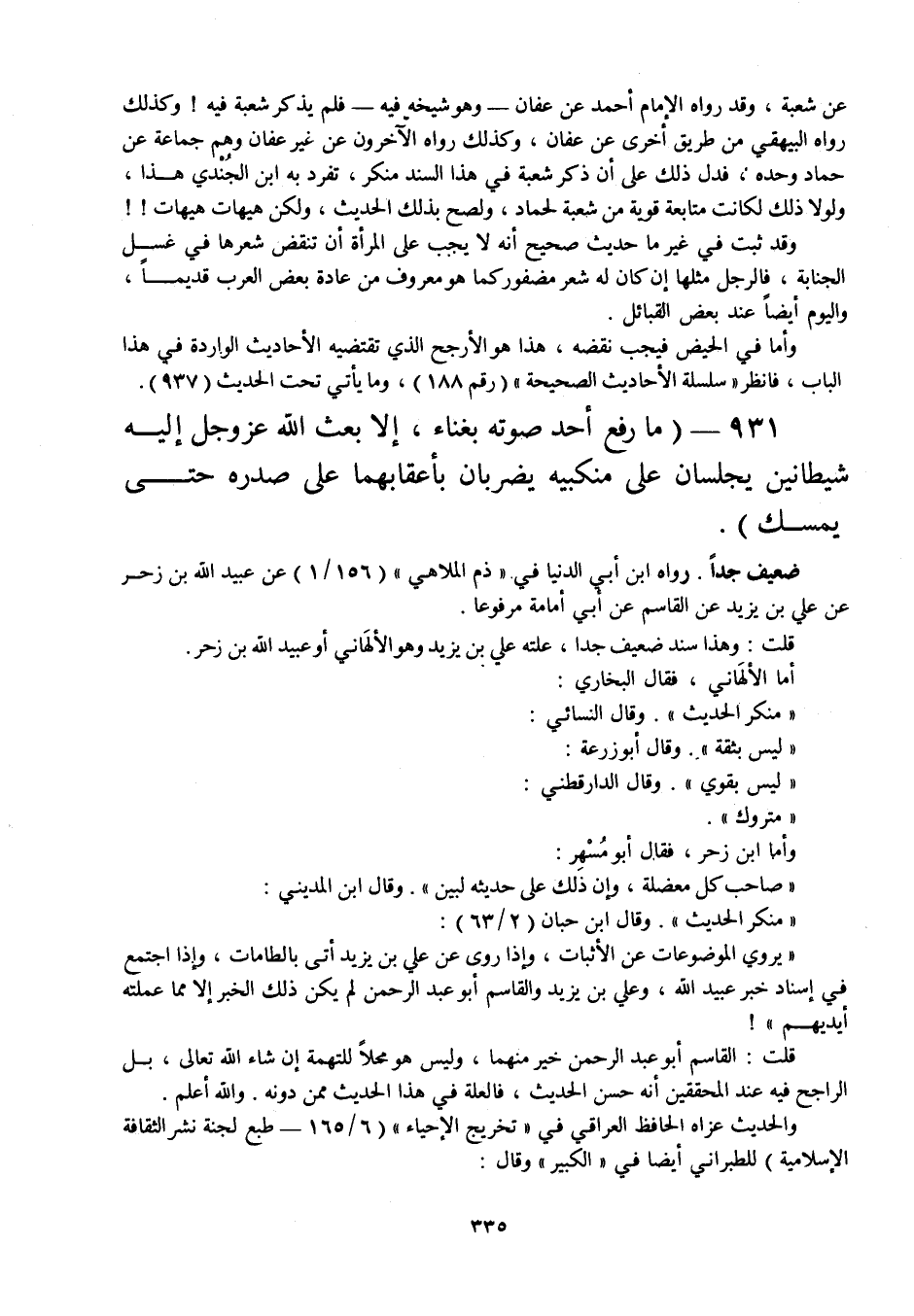 931 - " ما رفع أحد صوته بغناء، إلا بعث الله عز وجل إليه شيطانين يجلسان على منكبيه يضربان بأعقابهما على صدره حتى يمسك ".