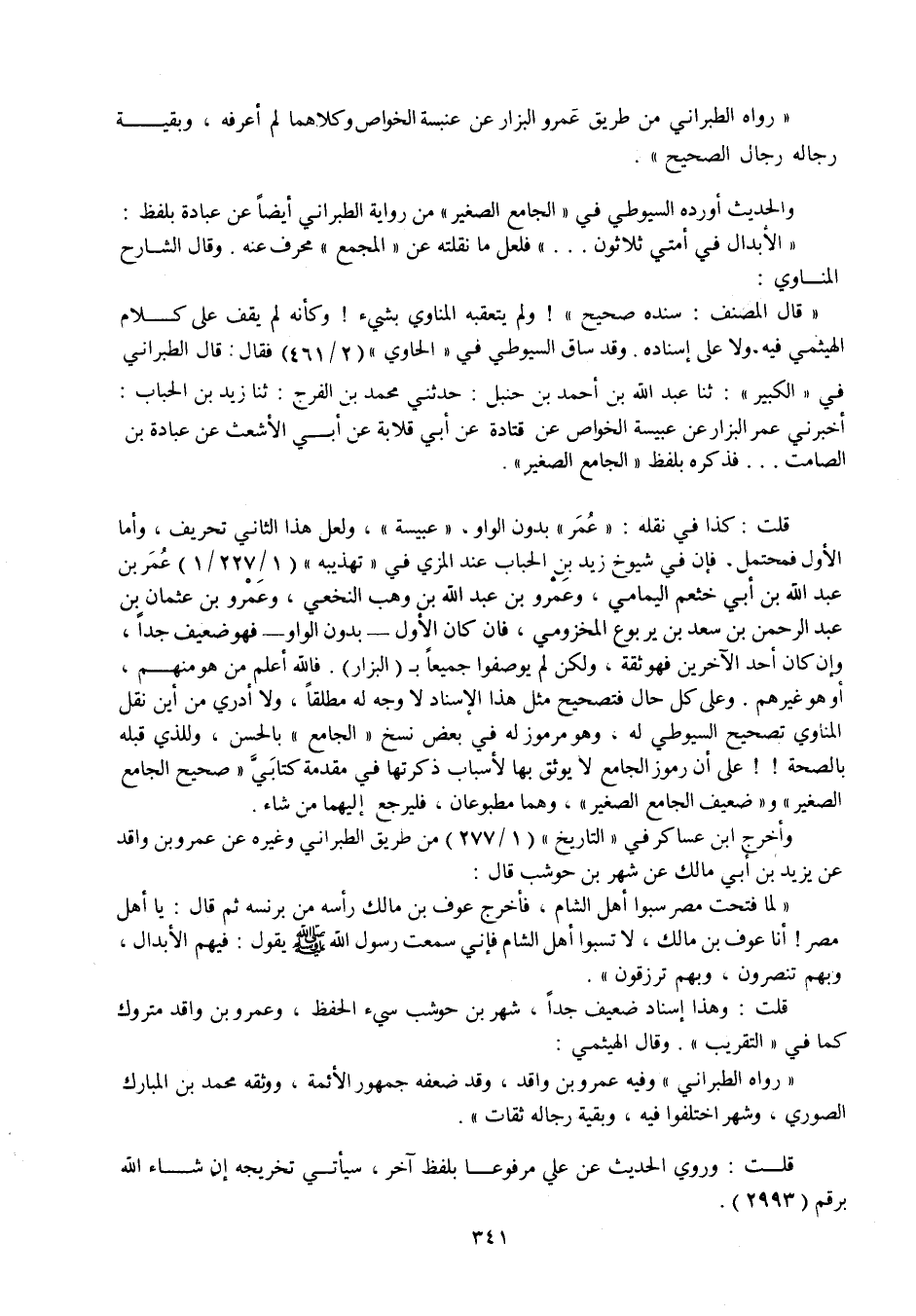 " رواه الطبراني من طريق عمرو البزار عن عنبسة الخواص وكلاهما لم أعرفه، وبقية رجاله رجال الصحيح ". والحديث أورده السيوطي في " الجامع الصغير " من رواية الطبراني أيضا عن عبادة بلفظ: " الأبدال في أمتي ثلاثون ... " فلعل ما نقلته عن " المجمع " محرف عنه. وقال الشارح المناوي: " قال المصنف: سنده صحيح "!