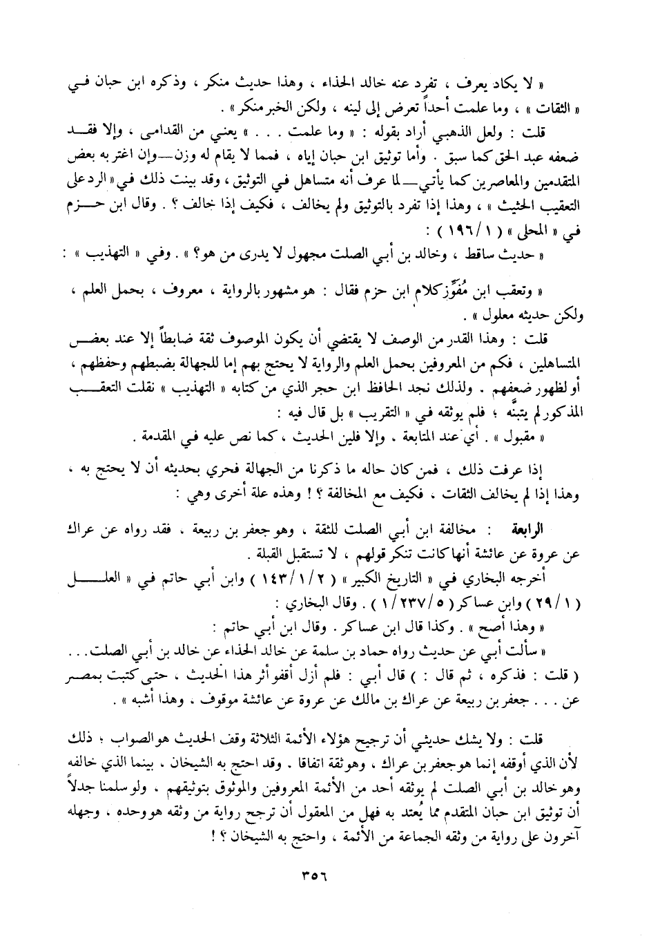 قلت: ولا يشك حديثي أن ترجيح هؤلاء الأئمة الثلاثة وقف الحديث هو الصواب، ذلك لأن الذي أوقفه إنما هو جعفر بن عراك، وهو ثقة اتفاقا، وقد احتج به الشيخان، بينما الذي خالفه وهو خالد بن أبي الصلت لم يوثقه أحد من الأئمة المعروفين والموثوق بتوثيقهم، ولو سلمنا. لا أن توثيق ابن حبان المتقدم مما يعتد به فهل من المعقول أن ترجح رواية من وثقه هو وحده.... آخرون على رواية من وثقه الجماعة من الأئمة، واحتج به الشيخان؟ !