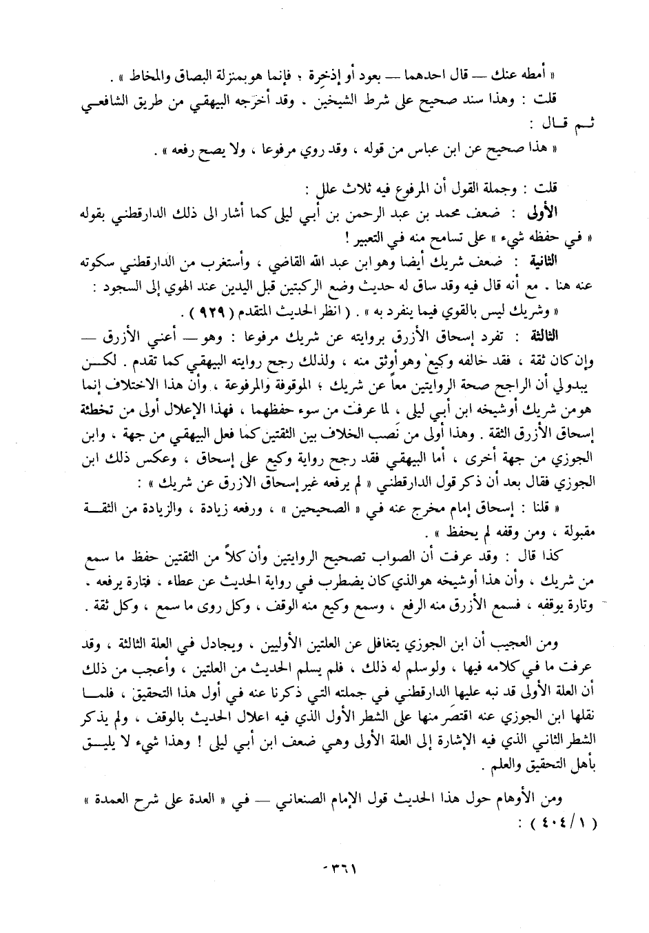 الثالثة: تفرد إسحاق الأزرق بروايته عن شريك مرفوعا، وهو - أعني الأزرق - وإن كان ثقة، فقد خالفه وكيع وهو أو ثق منه، ولذلك رجح روايته البيهقي كما تقدم، لكن يبدو لي أن الراجح صحة الروايتين معا عن شريك، الموقوفة والمرفوعة، وأن هذا الاختلاف إنما هو من شريك أو شيخه ابن أبي ليلى، لما عرفت من سوء حفظهما، فهذا الإعلال أولى من تخطئة إسحاق الأزرق الثقة، وهذا أولى من نصب الخلاف بين الثقتين كما فعل البيهقي من جهة، وابن الجوزي من جهة أخرى، أما البيهقي فقد رجح رواية وكيع على إسحاق، وعكس ذلك ابن الجوزي فقال بعد أن ذكر قول الدارقطني " لم يرفعه غير إسحاق الأزرق عن شريك ": " قلنا إسحاق إمام مخرج عنه في " الصحيحين "، ورفعه زيادة، والزيادة من الثقة مقبولة، ومن وقفه لم يحفظ ".