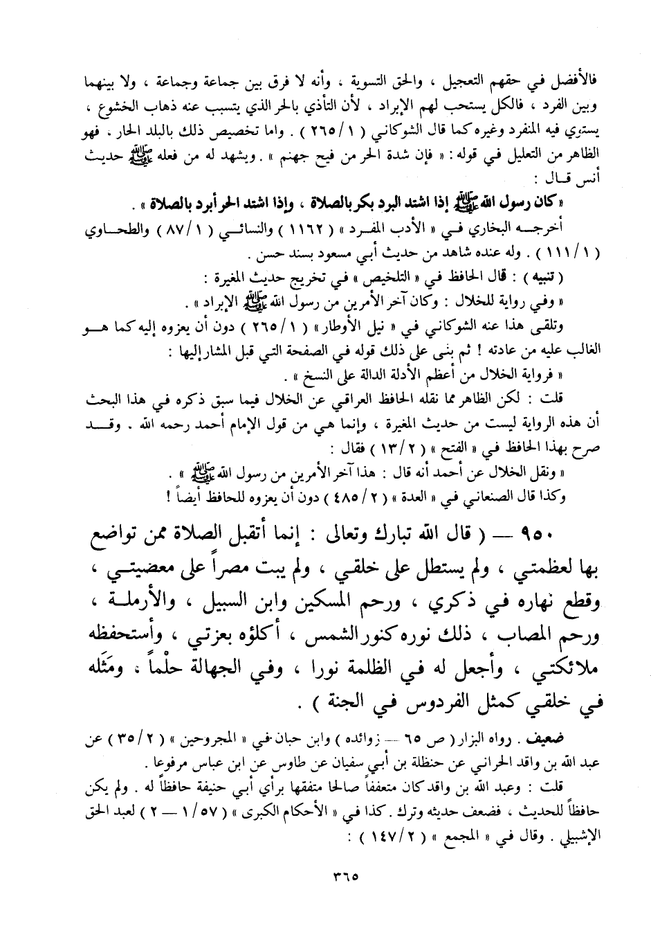 950 - " قال الله تبارك وتعالى: إنما أتقبل الصلاة ممن تواضع بها لعظمتي، ولم يستطل على خلقي، ولم يبت مصرا على معصيتي، وقطع نهاره في ذكري، ورحم المسكين وابن السبيل، والأرملة، ورحم المصاب، ذلك نوره كنور الشمس، أكلؤه بعزتي، وأستحفظه ملائكتي، وأجعل له في الظلمة نورا، وفي الجهالة حلما، ومثله في خلقي كمثل الفردوس في الجنة ".