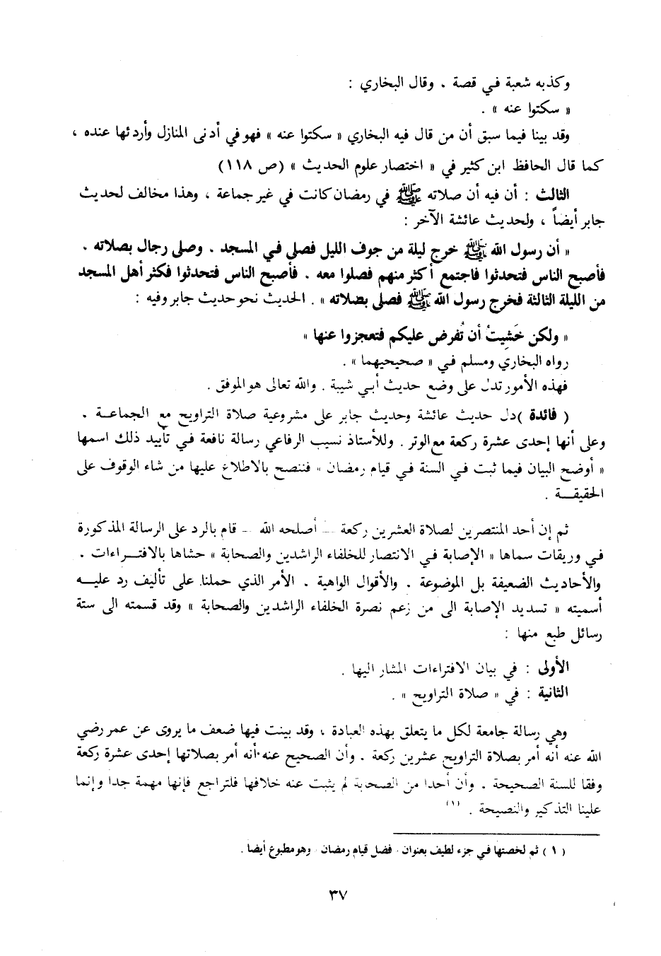 الثانية: في " صلاة التراويح ". وهي رسالة جامعة لكل ما يتعلق بهذه العبادة، وقد بينت فيها ضعف ما يروى عن عمر رضي الله عنه أنه أمر بصلاة التراويح عشرين ركعة، وأن الصحيح عنه أنه أمر بصلاتها إحدى عشرة ركعة وفقا للسنة الصحيحة، وأن أحدا من الصحابة لم يثبت عنه خلافها فلتراجع فإنها مهمة جدا وإنما علينا التذكير والنصيحة.