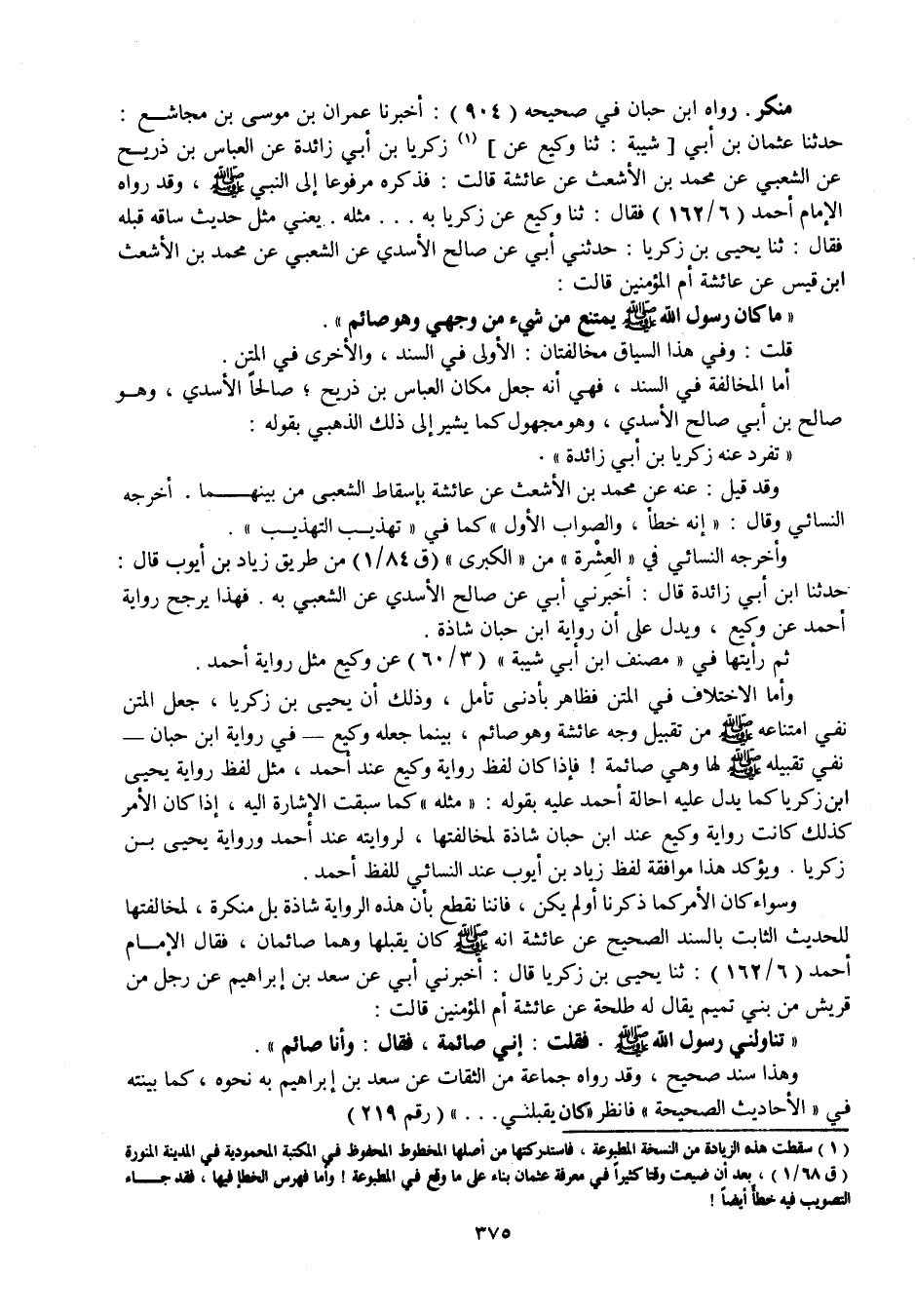 ثم رأيتها في " مصنف ابن أبي شيبة " (3 / 60) عن وكيع مثل رواية أحمد. وأما الاختلاف في المتن فظاهر بأدنى تأمل، وذلك أن يحيى بن زكريا، جعل المتن نفي امتناعه صلى الله عليه وسلم من تقبيل وجه عائشة وهو صائم، بينما جعله وكيع - في رواية ابن حبان - نفي تقبيله صلى الله عليه وسلم لها وهي صائمة! فإذا كان لفظ رواية وكيع عند أحمد، مثل لفظ رواية يحيى بن زكريا كما يدل عليه إحالة أحمد عليه بقوله: " مثله " كما سبقت الإشارة إليه، إذا كان الأمر كذلك كانت رواية وكيع عند ابن حبان شاذة لمخالفتها، لروايته عند أحمد ورواية يحيى بن زكريا، ويؤكد هذا موافقة لفظ زياد بن أيوب عند النسائي للفظ أحمد. وسواء كان الأمر كما ذكرنا أولم يكن، فإننا نقطع بأن هذه الرواية شاذة بل منكرة، لمخالفتها للحديث الثابت بالسند الصحيح عن عائشة أنه صلى الله عليه وسلم كان يقبلها وهما صائمان، فقال الإمام أحمد (6 / 162) : حدثنا يحيى بن زكريا قال: أخبرني أبي عن سعد بن إبراهيم عن رجل من قريش من بني تميم يقال له طلحة عن عائشة أم المؤمنين قالت: " تناولني رسول الله صلى الله عليه وسلم، فقلت: إني صائمة، فقال: وأنا صائم ". وهذا سند صحيح، وقد رواه جماعة من الثقات عن سعد بن إبراهيم به نحوه كما بينته في " الأحاديث الصحيحة " فانظر " كان يقبلني ... " (رقم 219) .