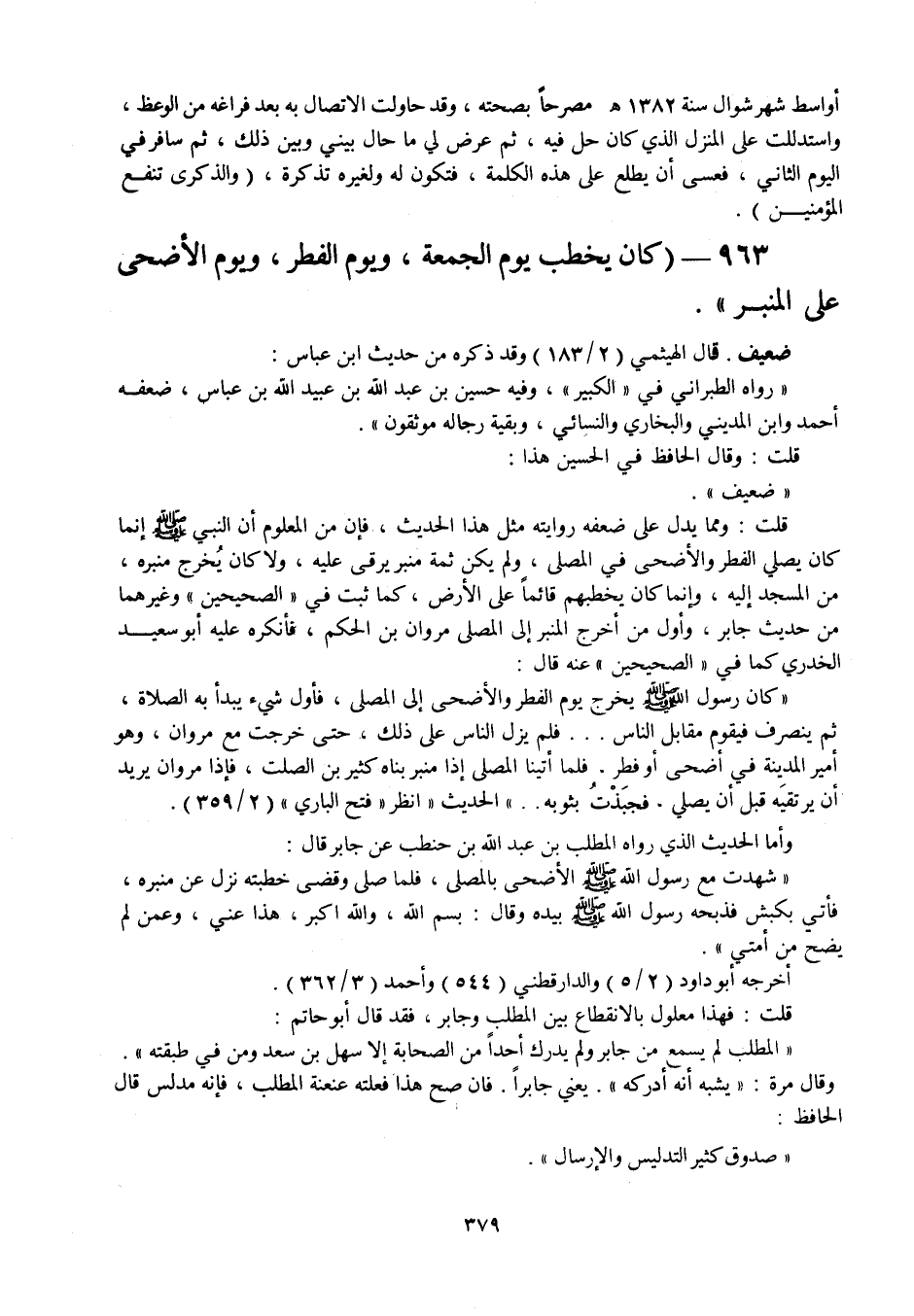 963 - " كان يخطب يوم الجمعة، ويوم الفطر، ويوم الأضحى على المنبر ".