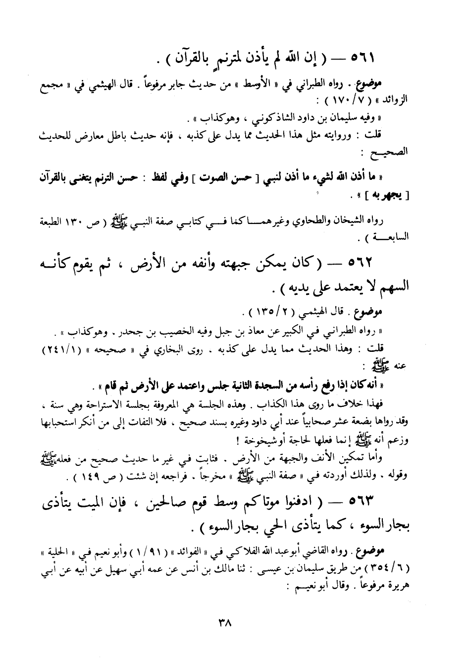 فهذا خلاف ما روى هذا الكذاب. وهذه الجلسة هي المعروفة بجلسة الاستراحة وهي سنة، وقد رواها بضعة عشر صحابيا عند أبي داود وغيره بسند صحيح، فلا التفات إلى من أنكر استحبابها وزعم أنه صلى الله عليه وسلم إنما فعلها لحاجة أو شيخوخة! وأما تمكين الأنف والجبهة من الأرض، فثابت في غير ما حديث صحيح من فعله صلى الله عليه وسلم وقوله، ولذلك أوردته في " صفة النبي صلى الله عليه وسلم " مخرجا، فراجعه إن شئت (ص 149) .