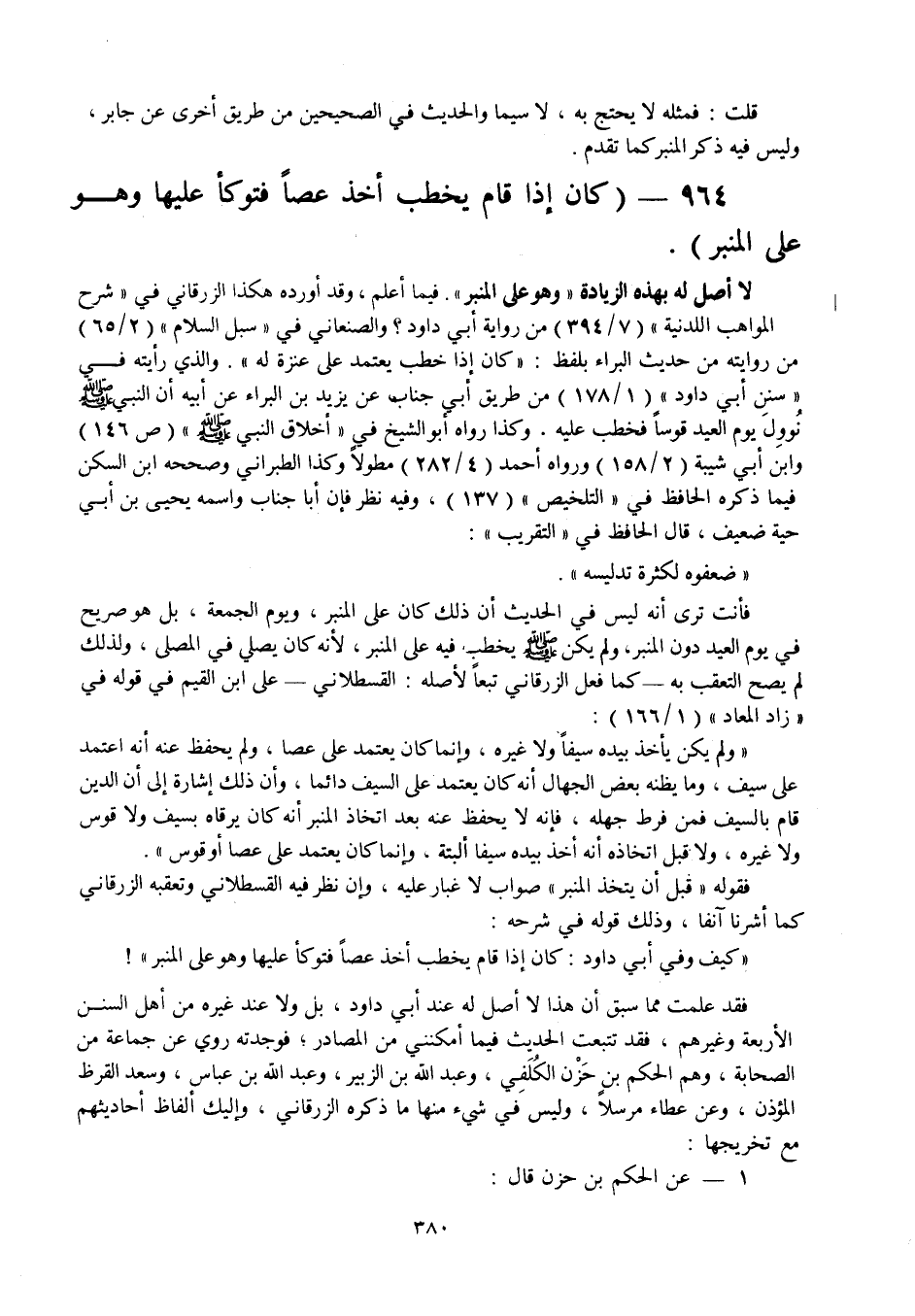 كان يعتمد على السيف دائما، وأن ذلك إشارة إلى الدين قام بالسيف فمن فرط جهله، فإنه لا يحفظ عنه بعد اتخاذ المنبر أنه كان يرقاه بسيف ولا قوس ولا غيره، ولا قبل اتخاذه أنه أخذ بيده سيفا ألبتة، وإنما كان يعتمد على عصا أو قوس ". فقوله " قبل أن يتخذ المنبر " صواب لا غبار عليه، وإن نظر فيه القسطلاني وتعقبه الزرقاني كما أشرنا آنفا، وذلك قوله في شرحه: " كيف وفي أبي داود: كان إذا قام يخطب أخذ عصا فتوكأ عليها وهو على المنبر "! فقد علمت مما سبق أن هذا لا أصل له عند أبي داود، بل ولا عند غيره من أهل السنن الأربعة وغيرهم، فقد تتبعت الحديث فيما أمكنني من المصادر، فوجدته روي عن جماعة من الصحابة، وهم الحكم بن حزن الكلفي وعبد الله بن الزبير وعبد الله بن عباس وسعد القرظ المؤذن، وعن عطاء مرسلا، وليس في شيء منها ما ذكره الزرقاني، وإليك ألفاظ أحاديثهم ما تخريجها: