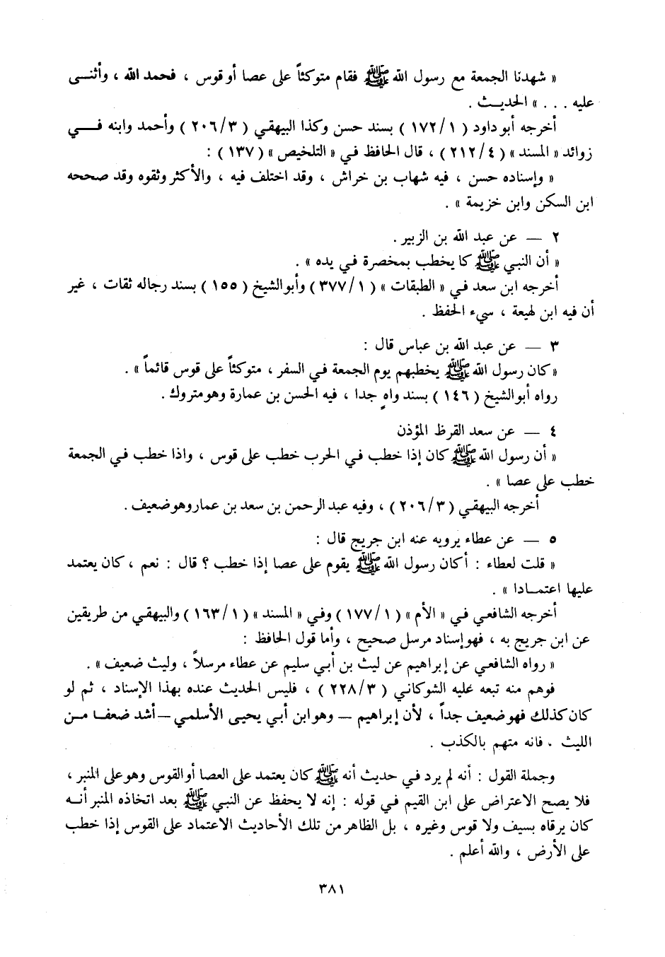 4 - عن سعد القرظ المؤذن " أن رسول الله صلى الله عليه وسلم كان إذا خطب في الحرب خطب على قوس، وإذا خطب في الجمعة خطب على عصا ". أخرجه البيهقي (3 / 206) ، وفيه عبد الرحمن بن سعد بن عمار وهو ضعيف.