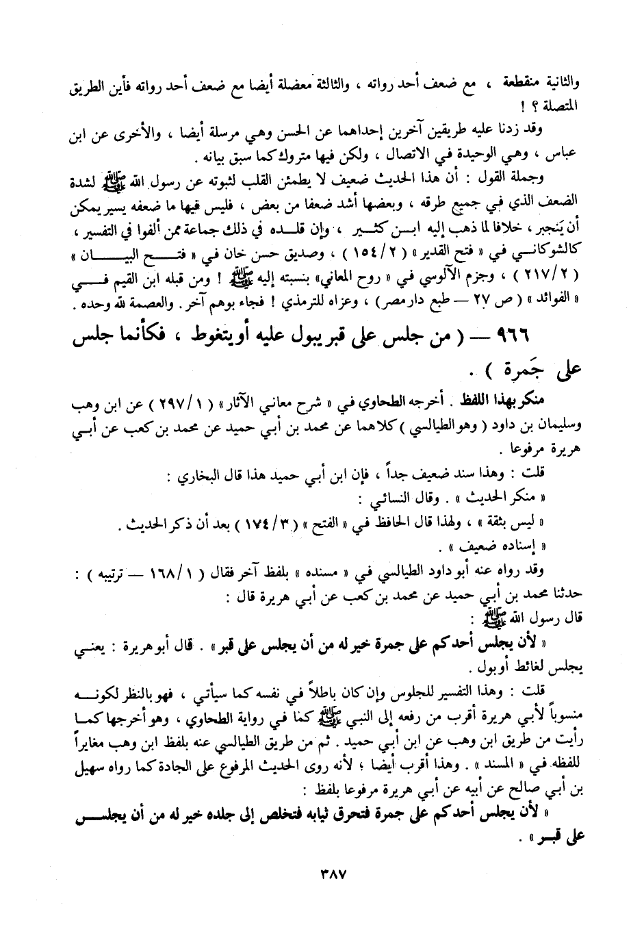 966 - " من جلس على قبر يبول عليه أو يتغوط، فكأنما جلس على جمرة ".