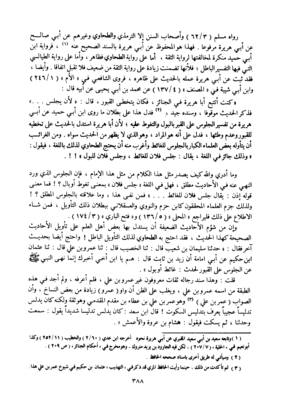 رواه مسلم (3 / 62) وأصحاب السنن إلا الترمذي والطحاوي وغيرهم عن أبي صالح عن أبي هريرة مرفوعا، فهذا هو المحفوظ عن أبي هريرة بالسند الصحيح عنه (1) ، فرواية ابن أبي حميد منكرة لمخالفتها لرواية الثقة، أما على رواية الطحاوي فظاهر، وأما على رواية الطيالسي التي فيها التفسير الباطل، فلأنها تضمنت زيادة على رواية الثقة من ضعيف فلا تقبل اتفاقا، وأيضا، فقد ثبت عن أبي هريرة عمله بالحديث على ظاهره، فروى الشافعي في " الأم " (1 / 246) وابن أبي شيبة في " المصنف " (4 / 137) عن محمد بن أبي يحيى عن أبيه قال: " كنت أتتبع أبا هريرة في الجنائز، فكان يتخطى القبور، قال: " لأن يجلس ... " فذكر الحديث موقوفا، وسنده جيد (2) فدل هذا على بطلان ما روى ابن أبي حميد عن أبي هريرة من تفسير الجلوس على القبر بالبول والتغوط عليه، لأن أبا هريرة استدل بالحديث على تخطيه للقبور وعدم وطئها، فدل على أنه هو المراد، وهو الذي لا يظهر من الحديث سواه، ومن الغرائب أن يتأوله بعض العلماء الكبار بالجلوس للغائط وأغرب منه أن يحتج الطحاوي لذلك باللغة، فيقول: " وذلك جائز في اللغة، يقال: جلس فلان للغائط، وجلس فلان للبول "!! .