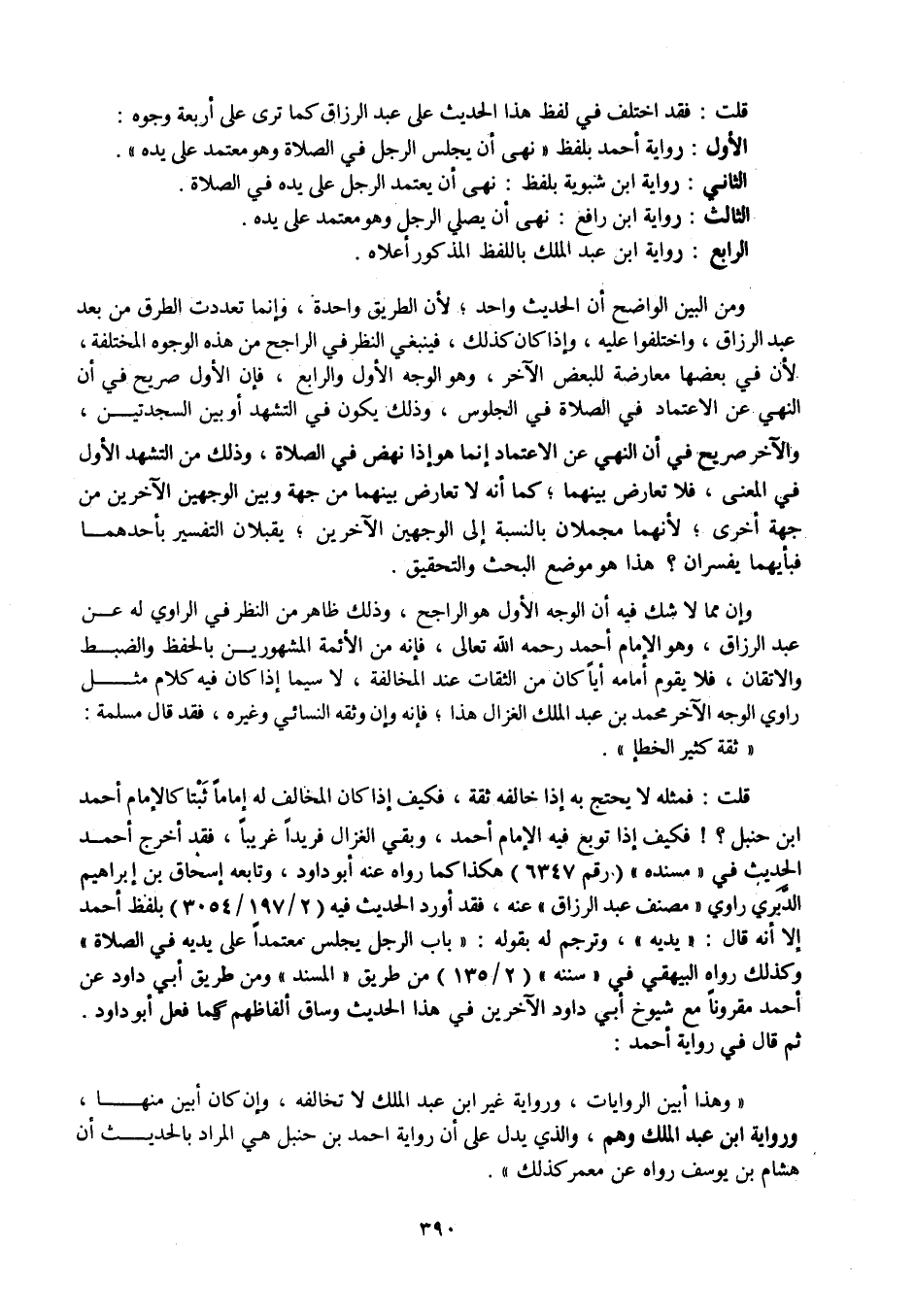 الرابع: رواية عبد الملك باللفظ المذكور أعلاه. ومن البين الواضح أن الحديث واحد لأن الطريق واحد، وإنما تعددت الطرق من بعد عبد الرزاق، واختلفوا عليه، وإذا كان كذلك، فينبغي النظر في الراجح من هذه الوجوه المختلفة، لأن في بعضها معارضة للبعض الآخر، وهو الوجه الأول والرابع، فإن الأول صريح في أن النهي عن الاعتماد في الصلاة في الجلوس، وذلك يكون في التشهد أو بين السجدتين، والآخر صريح في أن النهي عن الاعتماد إنما هو إذا نهض في الصلاة وذلك من التشهد الأول في المعنى، فلا تعارض بينهما، كما أنه لا تعارض بينهما من جهة وبين الوجهين الآخرين من جهة أخرى، لأنهما مجملان بالنسبة إلى الوجهين الآخرين، يقبلان التفسير بأحدهما فبأيهما يفسران؟ هذا هو موضع البحث والتحقيق. ومما لا شك فيه أن الوجه الأول هو الراجح، وذلك ظاهر من النظر في الراوي له عن عبد الرزاق، وهو الإمام أحمد رحمه الله تعالى، فإنه من الأئمة المشهور ين بالحفظ والضبط والإتقان، فلا يقوم أمامه أيا كان من الثقات عند المخالفة، لاسيما إذا كان فيه كلام مثل راوي الوجه الآخر محمد بن عبد الملك الغزال هذا، فإنه وإن وثقه النسائي وغيره، فقد قال مسلمة: " ثقة كثير الخطأ ".