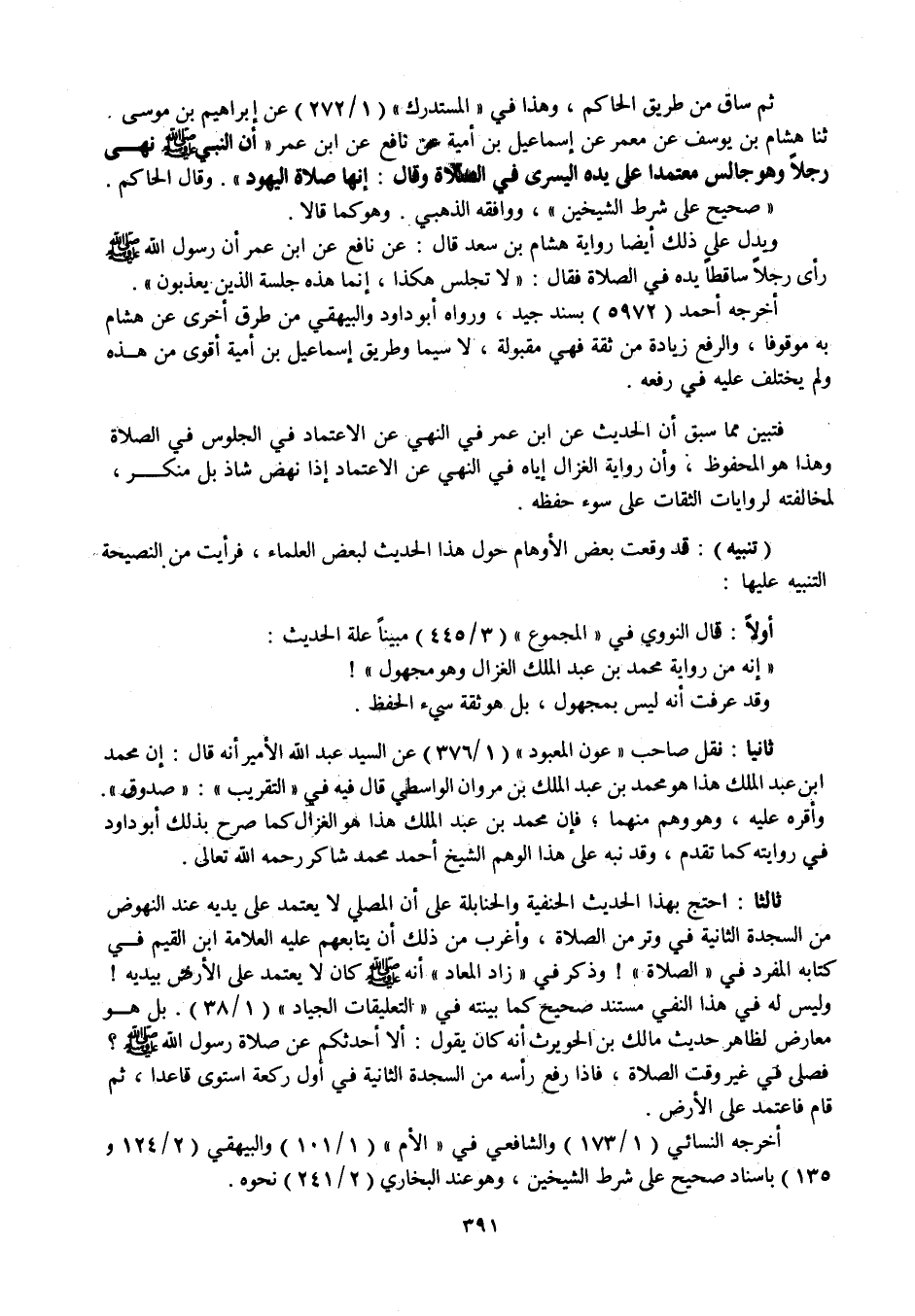 فتبين مما سبق أن الحديث عن ابن عمر في النهي عن الاعتماد في الجلوس في الصلاة وهذا هو المحفوظ، وأن رواية الغزال إياه في النهي عن الاعتماد إذا نهض شاذ بل منكر، لمخالفته لروايات الثقات على سوء حفظه.