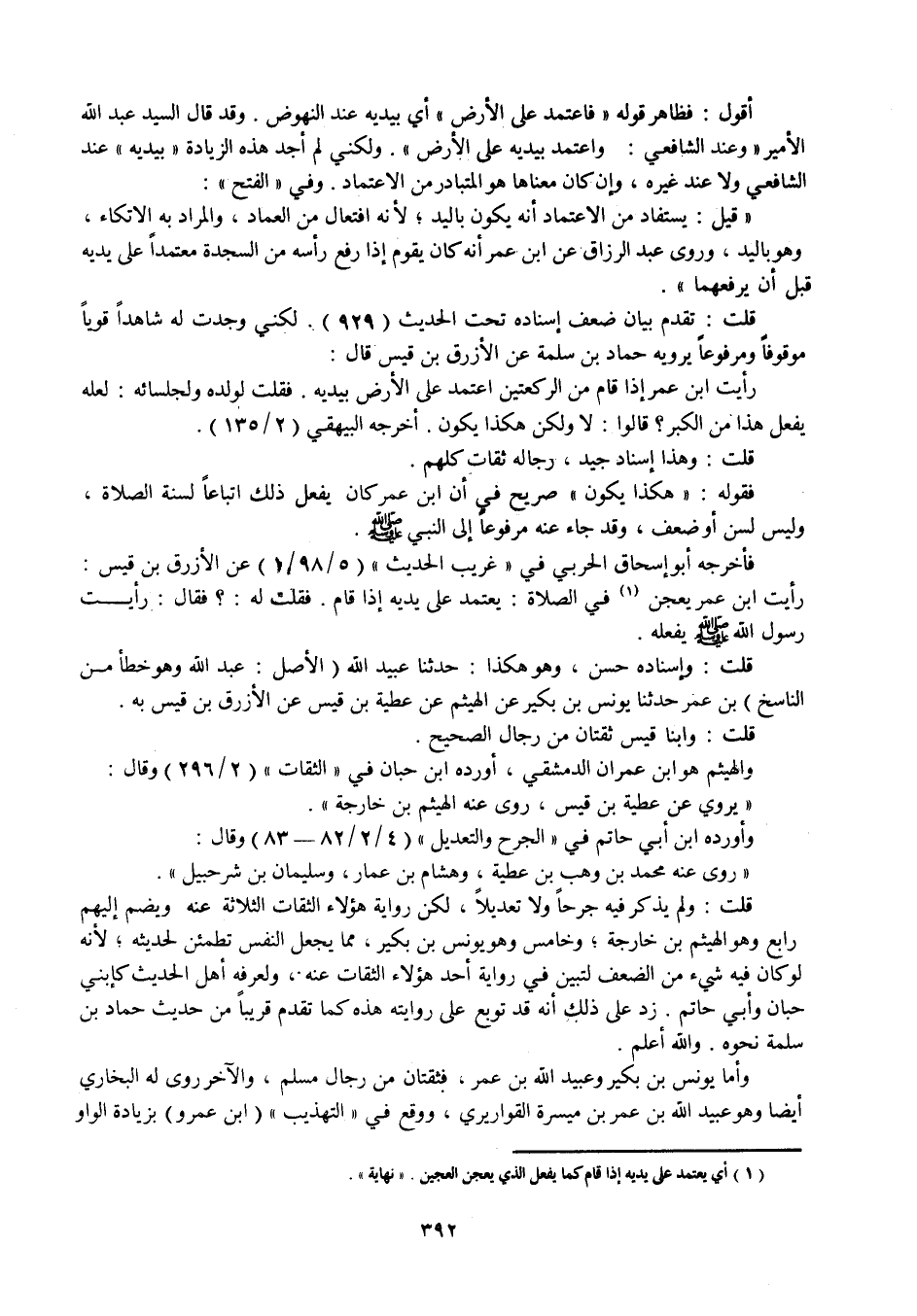 قلت: وهذا إسناد جيد رجاله ثقات كلهم. فقوله: " هكذا يكون " صريح في أن ابن عمر كان يفعل ذلك اتباعا لسنة الصلاة، وليس لسن أو ضعف، وقد جاء عنه مرفوعا إلى النبي صلى الله عليه وسلم. فأخرجه أبو إسحاق الحربي في " غريب الحديث " (5 / 98 / ... ) عن الأزرق بن قيس: رأيت ابن عمر يعجن (1) في الصلاة: يعتمد على يديه في الصلاة إذا قام، فقلت له:؟ فقال: رأيت رسول الله صلى الله عليه وسلم يفعله.