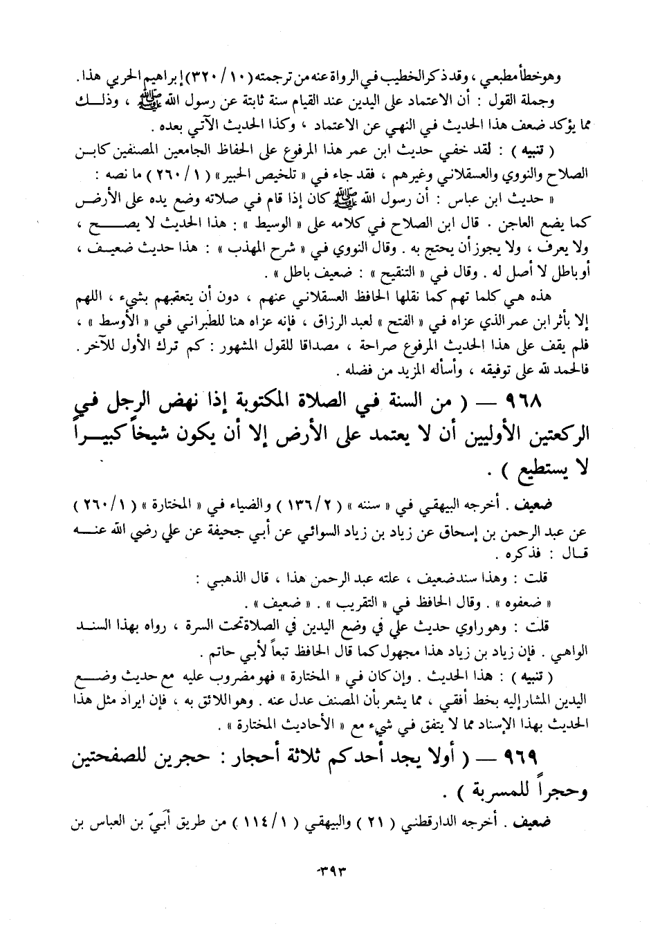 968 - " من السنة في الصلاة المكتوبة إذا نهض الرجل في الركعتين الأوليين أن لا يعتمد على الأرض إلا أن يكون شيخا كبيرا لا يستطيع ".