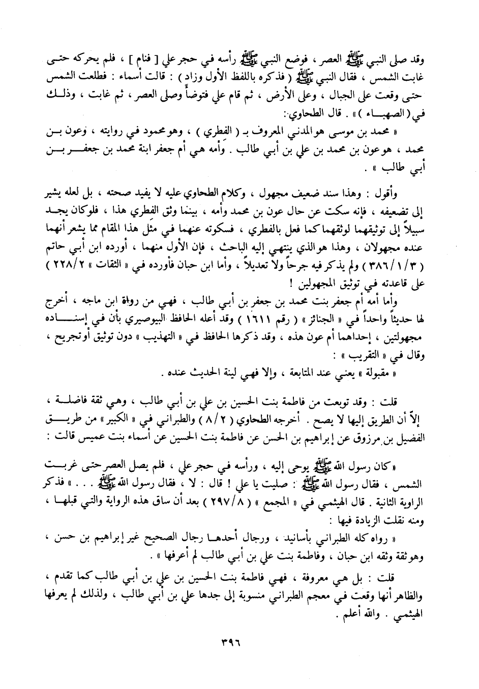 ، فلم يصل العصر حتى غربت الشمس فقال رسول الله صلى الله عليه وسلم: صليت يا علي؟ قال: لا، فقال رسول الله صلى الله عليه وسلم: ... " فذكر الرواية الثانية، قال الهيثمي في " المجمع " (8 / 297) بعد أن ساق هذه الرواية والتي قبلها، ومنه نقلت الزيادة فيها: " رواه كله الطبراني بأسانيد، ورجال أحدها رجال الصحيح غير إبراهيم بن حسن وهو ثقة وثقه ابن حبان، وفاطمة بنت علي بن أبي طالب لم أعرفها ".