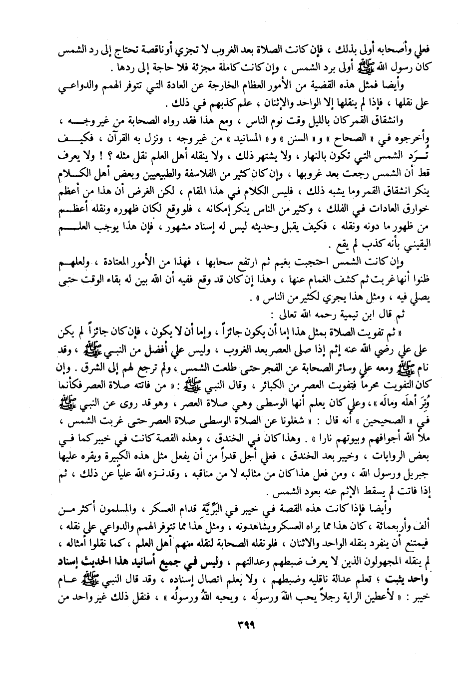 فعلي وأصحابه أولى بذلك، فإن كانت الصلاة بعد الغروب لا تجزي أو ناقصة تحتاج إلى رد الشمس كان رسول الله صلى الله عليه وسلم أولى برد الشمس، وإن كانت كاملة مجزئة فلا حاجة إلى ردها. وأيضا فمثل هذه القضية من الأمور العظام الخارجة عن العادة التي تتوفر الهمم والدواعي على نقلها، فإذا لم ينقلها إلا الواحد والاثنان، علم كذبهم في ذلك. وانشقاق القمر كان بالليل وقت نوم الناس، ومع هذا فقد رواه الصحابة من غير وجه، وأخرجوه في " الصحاح " و" السنن " و" المسانيد " من غير وجه، ونزل به القرآن، فكيف ترد الشمس التي تكون بالنهار، ولا يشتهر ذلك، ولا ينقله أهل العلم نقل مثله؟ ! ولا يعرف قط أن الشمس رجعت بعد غروبها، وإن كان كثير من الفلاسفة والطبيعين وبعض أهل الكلام ينكر انشقاق القمر وما يشبه ذلك، فليس الكلام في هذا المقام، لكن الغرض أن هذا من أعظم خوارق العادات في الفلك، وكثير من الناس ينكر إمكانه، فلووقع لكان ظهوره ونقله أعظم من ظهور ما دونه ونقله، فكيف يقبل وحديثه ليس له إسناد مشهور، فإن هذا يوجب العلم اليقيني بأنه كذب لم يقع. وإن كانت الشمس احتجبت بغيم ثم ارتفع سحابها، فهذا من الأمور المعتادة، ولعلهم ظنوا أنها غربت ثم كشف الغمام عنها، وهذا إن كان قد وقع ففيه أن الله بين له بقاء الوقت حتى يصلي فيه، ومثل هذا يجري لكثير من الناس ".