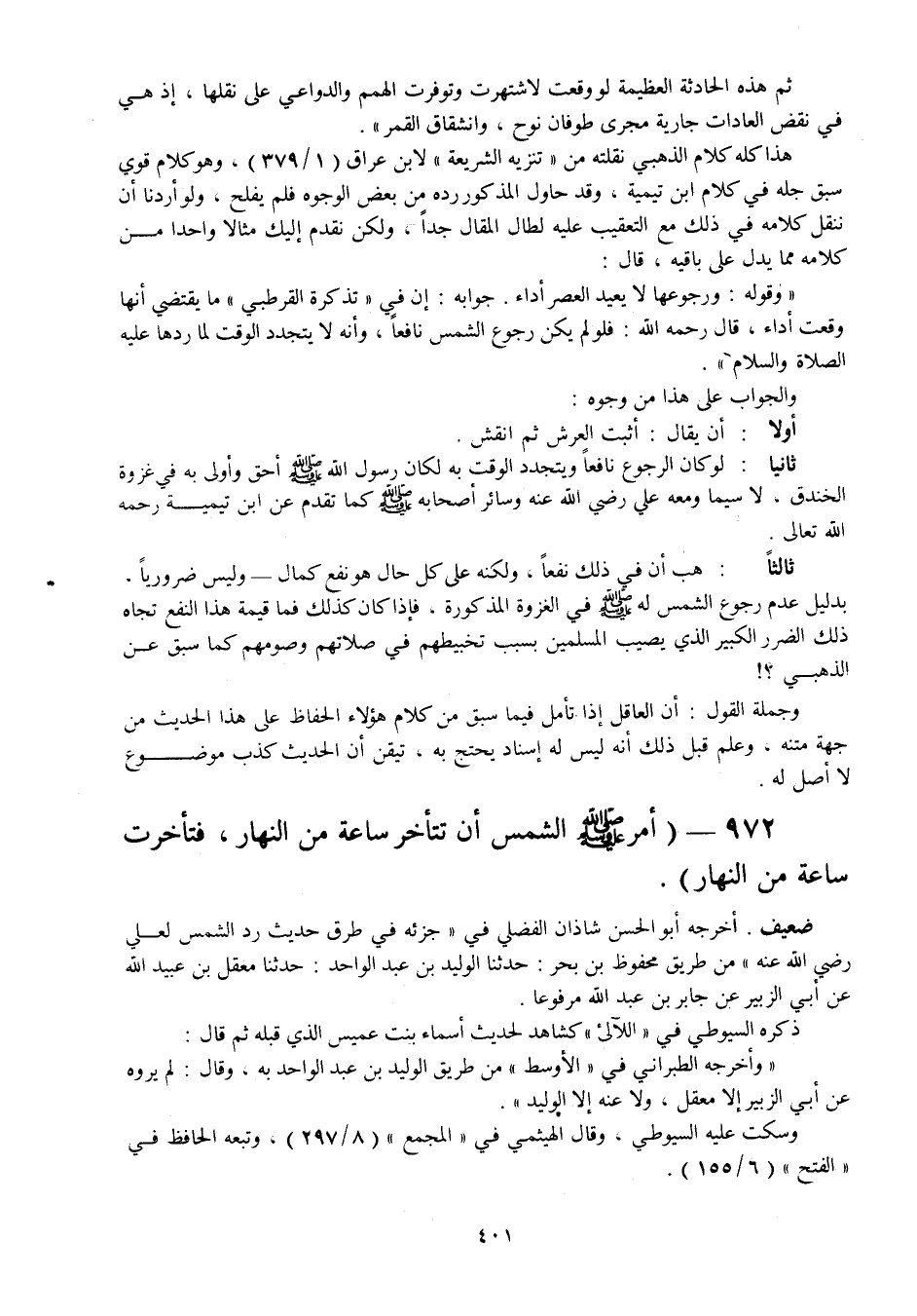 ثم هذه الحادثة العظيمة لو وقعت لاشتهرت وتوفرت الهمم والدواعي على نقلها. إذ هي في نقض العادات جارية مجرى طوفان نوح، وانشقاق القمر ". هذا كله كلام الذهبي نقلته من " تنزيه الشريعة " لابن عراق (1 / 379) وهو كلام قوي سبق جله في كلام ابن تيمية، وقد حاول المذكور رده من بعض الوجوه فلم يفلح، ولوأردنا أن ننقل كلامه في ذلك مع التعقيب عليه لطال المقال جدا، ولكن نقدم إليك مثالا واحدا من كلامه مما يدل على باقيه، قال: " وقوله: ورجوعها لا يعيد العصر أداء.