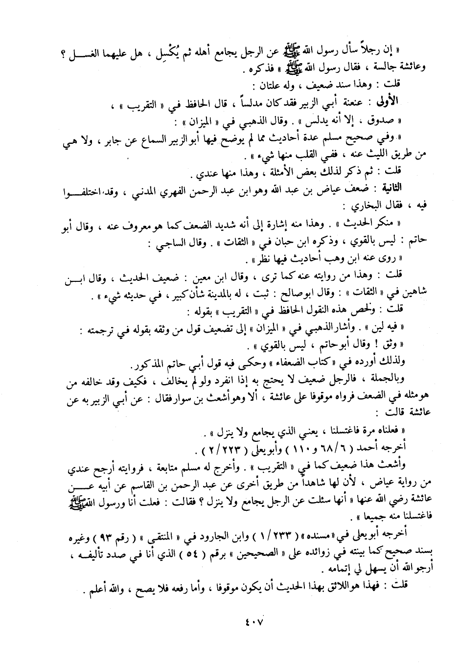 " إن رجلا سأل رسول الله صلى الله عليه وسلم عن الرجل يجامع أهله ثم يكسل، هل عليهما الغسل؟ وعائشة جالسة، فقال رسول الله صلى الله عليه وسلم: " فذكره. قلت وهذا إسناد ضعيف وله علتان: الأولى: عنعنة أبي الزبير فقد كان مدلسا، قال الحافظ في " التقريب ": " صدوق، إلا أنه يدلس ". وقال الذهبي في " الميزان ": " وفي صحيح مسلم عدة أحاديث مما لم يوضح فيها أبو الزبير السماع عن جابر، ولا هي من طريق الليث عنه، ففي القلب منها شيء ". قلت: ثم ذكر لذلك بعض الأمثلة، وهذا منها عندي. الثانية: ضعف عياض بن عبد الله وهو ابن عبد الرحمن الفهري المدني، وقد اختلفوا فيه فقال البخاري: " منكر الحديث ".