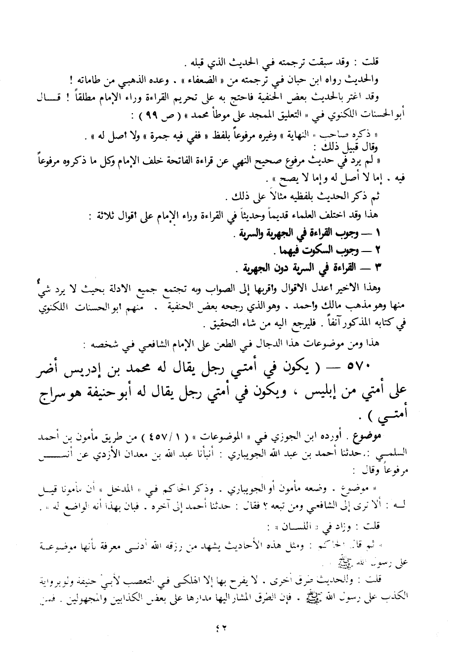 الفاتحة خلف الإمام وكل ما ذكروه مرفوعا فيه، إما لا أصل له وإما لا يصح ".
