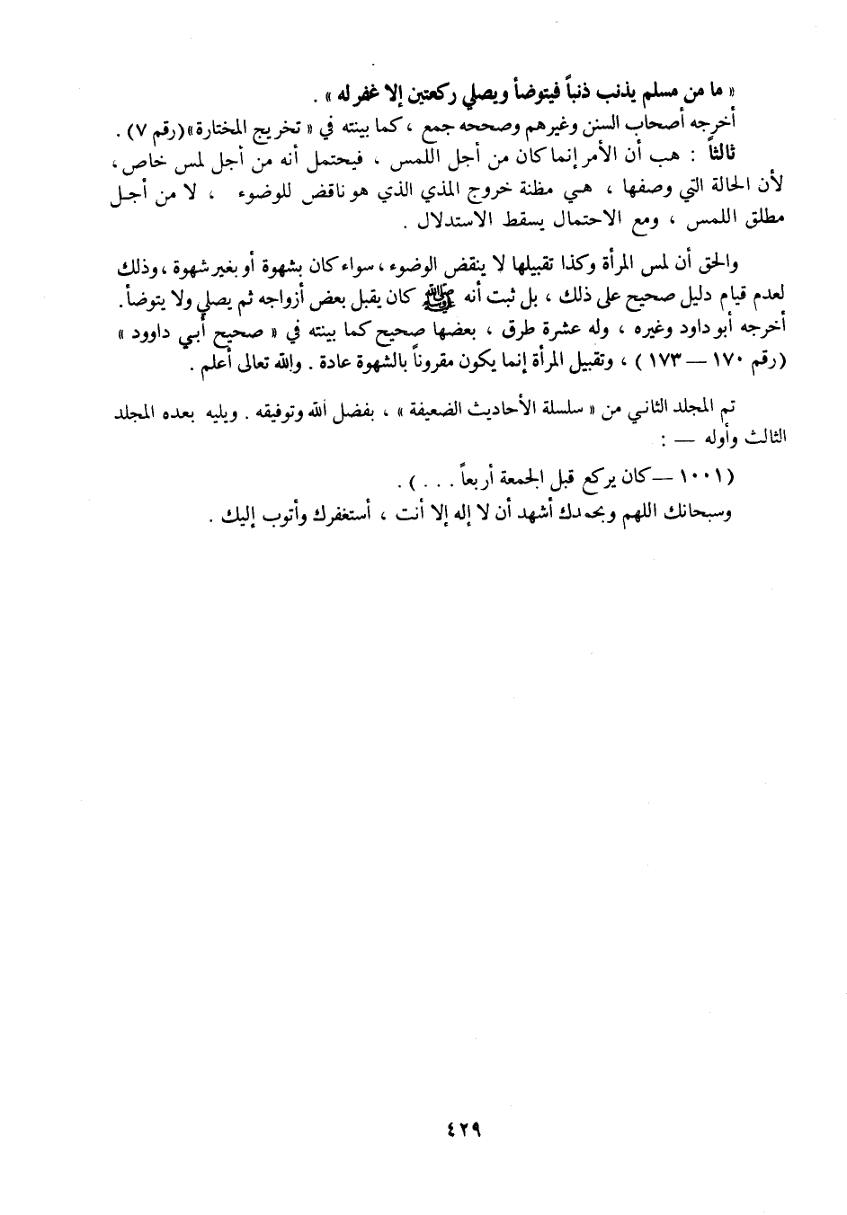 ثالثا: هب أن الأمر إنما كان من أجل اللمس، فيحتمل أنه من أجل لمس خاص، لأن الحالة التي وصفها، هي مظنة خروج المذي الذي هو ناقض للوضوء، لا من أجل مطلق اللمس، ومع الاحتمال يسقط الاستدلال. والحق أن لمس المرأة وكذا تقبيلها لا ينقض الوضوء، سواء كان بشهو ة أو بغير شهو ة، وذلك لعدم قيام دليل صحيح على ذلك، بل ثبت أنه صلى الله عليه وسلم كان يقبل بعض أزواجه ثم يصلي ولا يتوضأ. أخرجه أبو داود وغيره، وله عشرة طرق، بعضها صحيح كما بينته في " صحيح أبي داود " (رقم 170 - 173) وتقبيل المرأة إنما يكون مقرونا بالشهو ة عادة، والله أعلم.