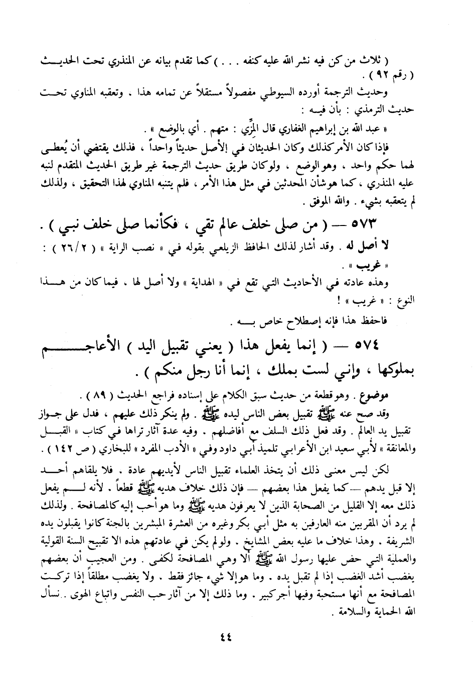 574 - " إنما يفعل هذا (يعني تقبيل اليد) الأعاجم بملوكها، وإني لست بملك، إنما أنا رجل منكم ".