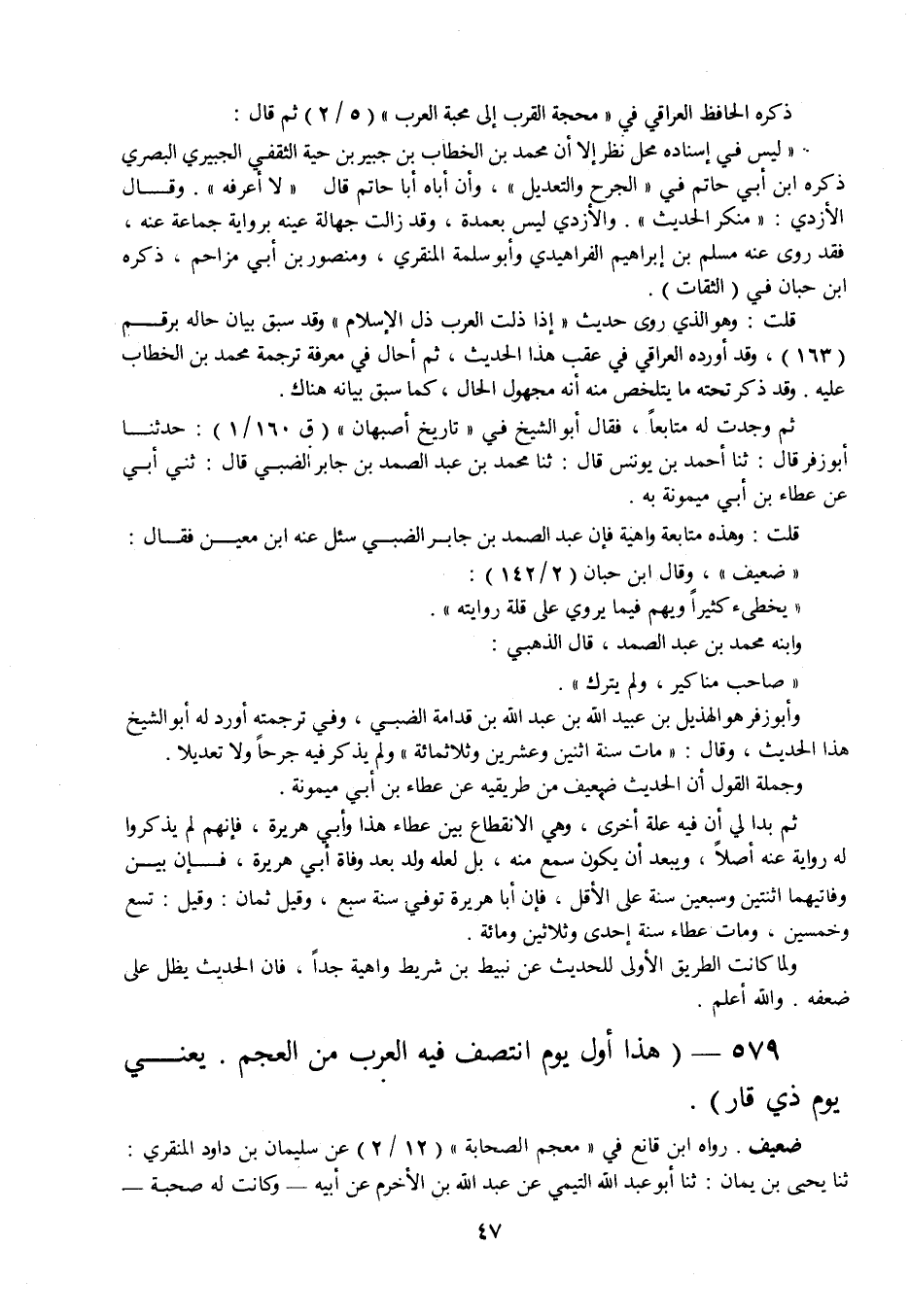 579 - " هذا أول يوم انتصف فيه العرب من العجم. يعني يوم ذي قار ".