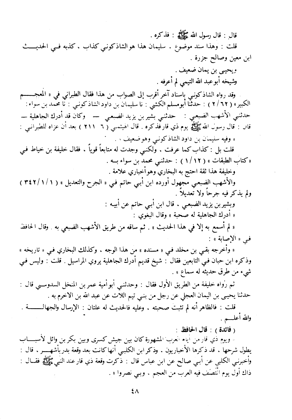 فائدة: قال الحافظ: " ويوم ذي قار من أيام العرب المشهورة كان بين جيش كسرى وبين بكر بن وائل لأسباب يطول شرحها، قد ذكرها الأخباريون، وذكر ابن الكلبي أنها كانت بعد وقعة بدر بأشهر، قال: وأخبرني الكلبي عن أبي صالح عن ابن عباس قال: ذكرت وقعة ذي قار عند النبي صلى الله عليه وسلم فقال: