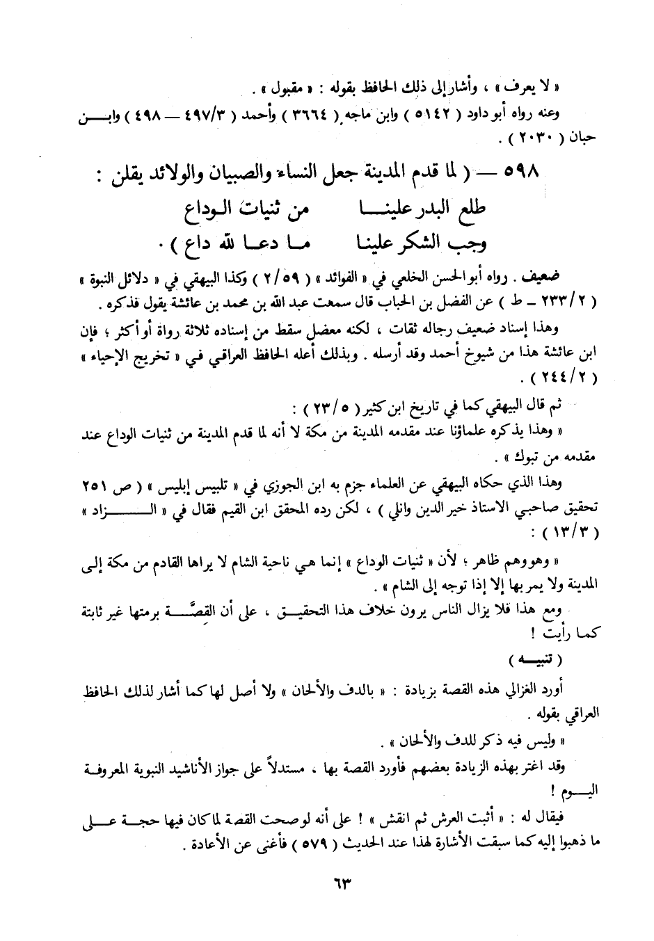 وبذلك أعله الحافظ العراقي في " تخريج الإحياء " (2 / 244) . ثم قال البيهقي كما في تاريخ ابن كثير (5 / 23) : " وهذا يذكره علماؤنا عند مقدمه المدينة من مكة لا أنه لما قدم المدينة من ثنيات الوداع عند مقدمه من تبوك ". وهذا الذي حكاه البيهقي عن العلماء جزم به ابن الجوزي في " تلبيس إبليس " (ص 251 تحقيق صاحبي الأستاذ خير الدين وانلي) ، لكن رده المحقق ابن القيم فقال في " الزاد " (3 / 13) : وهو وهم ظاهر لأن " ثنيات الوداع " إنما هي ناحية الشام لا يراها القادم من مكة إلى المدينة ولا يمر بها إلا إذا توجه إلى الشام ".