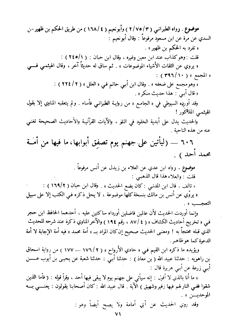 ومعنى الحديث صحيح إن كان المراد بـ " أمة محمد " فيه أمة الإجابة لا أمة الدعوة كما هو ظاهر. ويؤيده ما ذكره ابن القيم في " حادي الأرواح " (2 / 176 - 177) من رواية إسحاق بن راهويه: حدثنا عبيد الله (بن معاذ) : حدثنا أبي: حدثنا شعبة عن يحيى بن أيوب عن أبي زرعة عن أبي هريرة قال: " ما أنا بالذي لا أقول: إنه سيأتي على جهنم يوم لا يبقى فيها أحد، وقرأ قوله: (فأما الذين شقوا ففي النار لهم فيها زفير وشهيق) الآية.