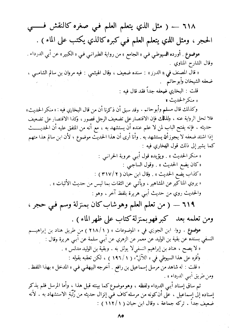 618 - " مثل الذي يتعلم العلم في صغره كالنقش في الحجر، ومثل الذي يتعلم العلم في كبره كالذي يكتب على الماء ".