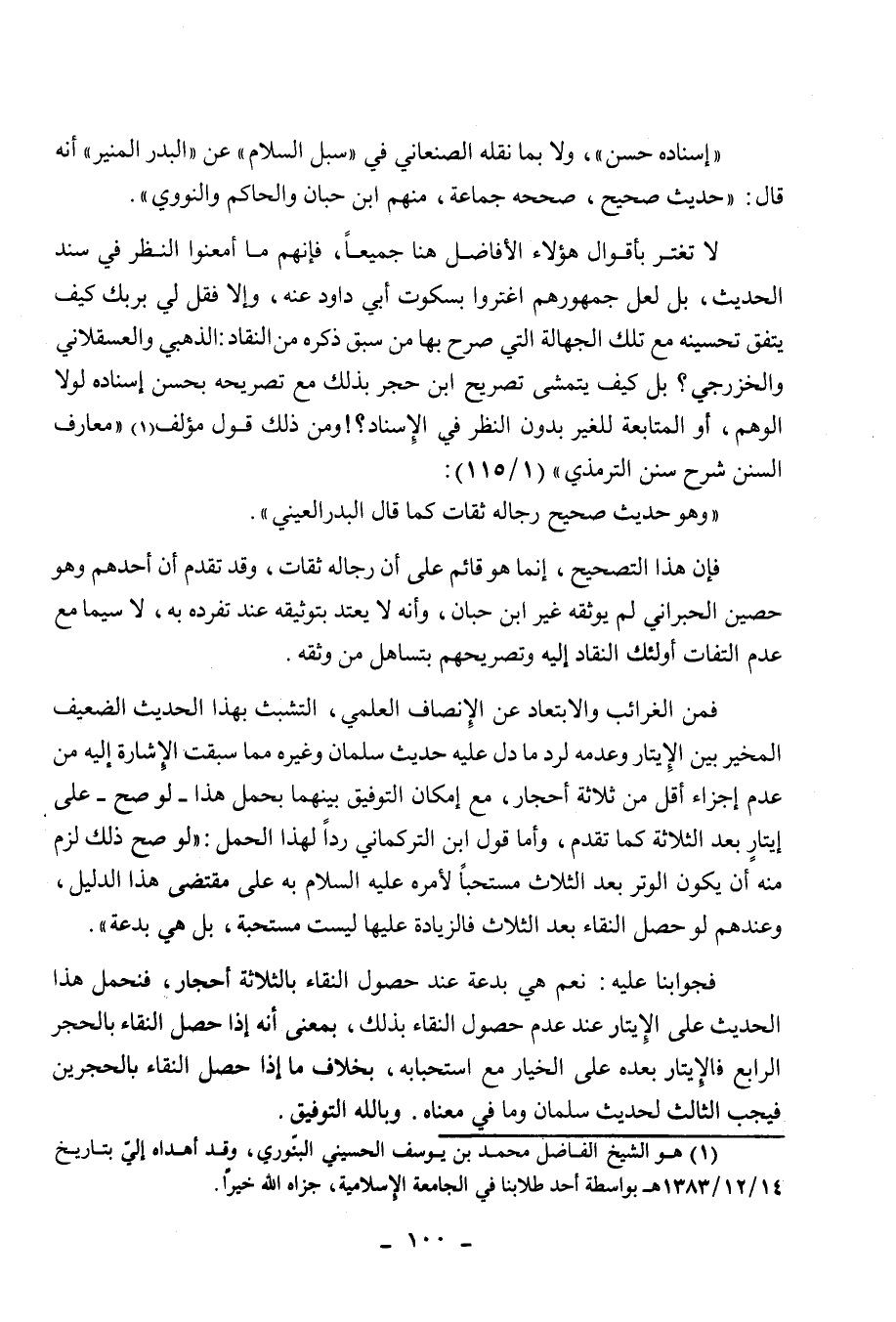 فمن الغرائب والابتعاد عن الإنصاف العلمي التشبث بهذا الحديث الضعيف المخير بين الإيتار وعدمه لرد ما دل عليه حديث سلمان وغيره مما سبق الإشارة إليه من عدم إجزاء أقل من ثلاثة أحجار، مع إمكان التوفيق بينهما بحمل هذا لو صح على إيتار بعد الثلاثة كما تقدم، وأما قول ابن التركماني ردا لهذا الحمل: لو صح ذلك لزم منه أن يكون الوتر بعد الثلاث مستحبا أمره عليه السلام به على مقتضى هذا الدليل، وعندهم لو حصل النقاء بعد الثلاث فالزيادة عليها ليست مستحبة، بل هي بدعة.