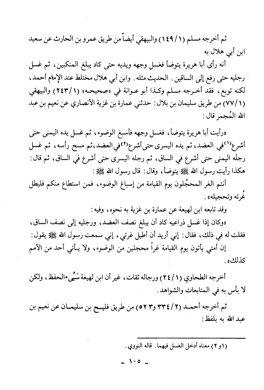 أنه رأى أبا هريرة يتوضأ فغسل وجهه ويديه حتى كاد يبلغ المنكبين، ثم غسل رجليه حتى رفع إلى الساقين، الحديث مثله، وابن أبي هلال مختلط عند الإمام أحمد، لكنه توبع، فقد أخرجه مسلم وكذا أبو عوانة في " صحيحه " (1/243) والبيهقي (1/77) من طريق سليمان بن بلال: حدثني عمارة بن غزية الأنصاري عن نعيم بن عبد الله المجمر قال: